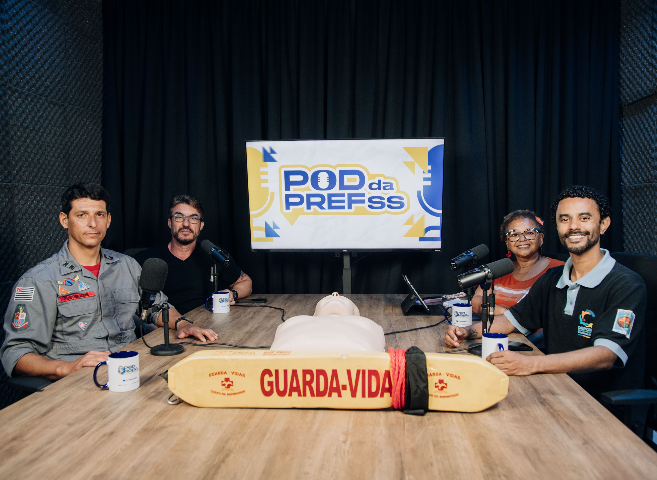 #PratodosVerem: Quatro pessoas participam de uma gravação de podcast em estúdio, com paredes revestidas por espuma acústica. À mesa, há microfones, canecas brancas personalizadas e um boneco de treinamento de primeiros socorros, junto a um flutuador amarelo escrito ‘GUARDA-VIDA’. Um dos participantes veste uniforme cinza com o nome Pustiglione e insígnias militares, outro usa camiseta preta, a apresentadora veste blusa laranja com listras, e o Apresentador participante usa uniforme preto com detalhes azuis e o brasão da Defesa Civil. Ao fundo, uma televisão exibe o logotipo ‘POD da PREFSS’. Em outra imagem, aparece o monitor de controle mostrando diferentes ângulos da gravação. Fim da descrição.