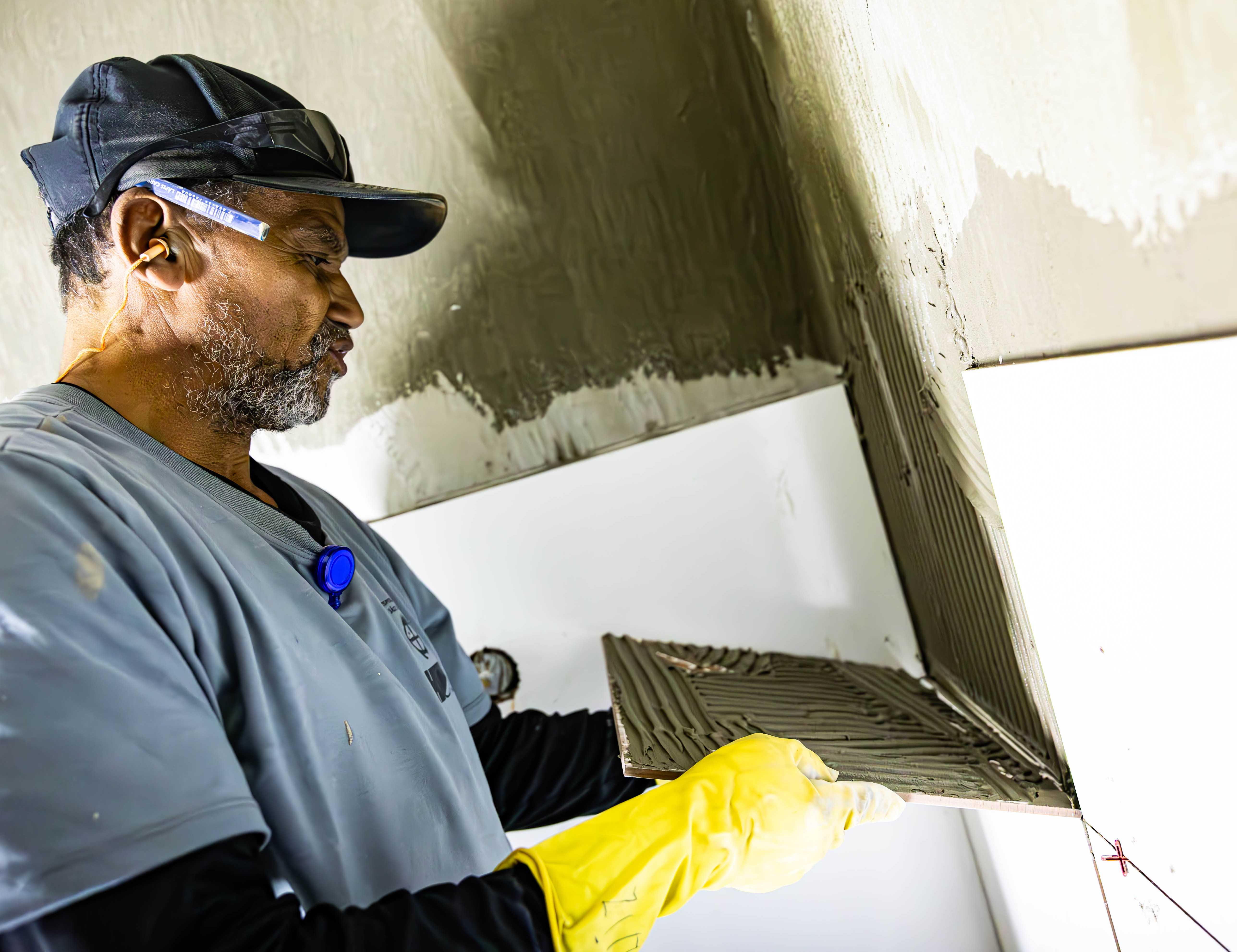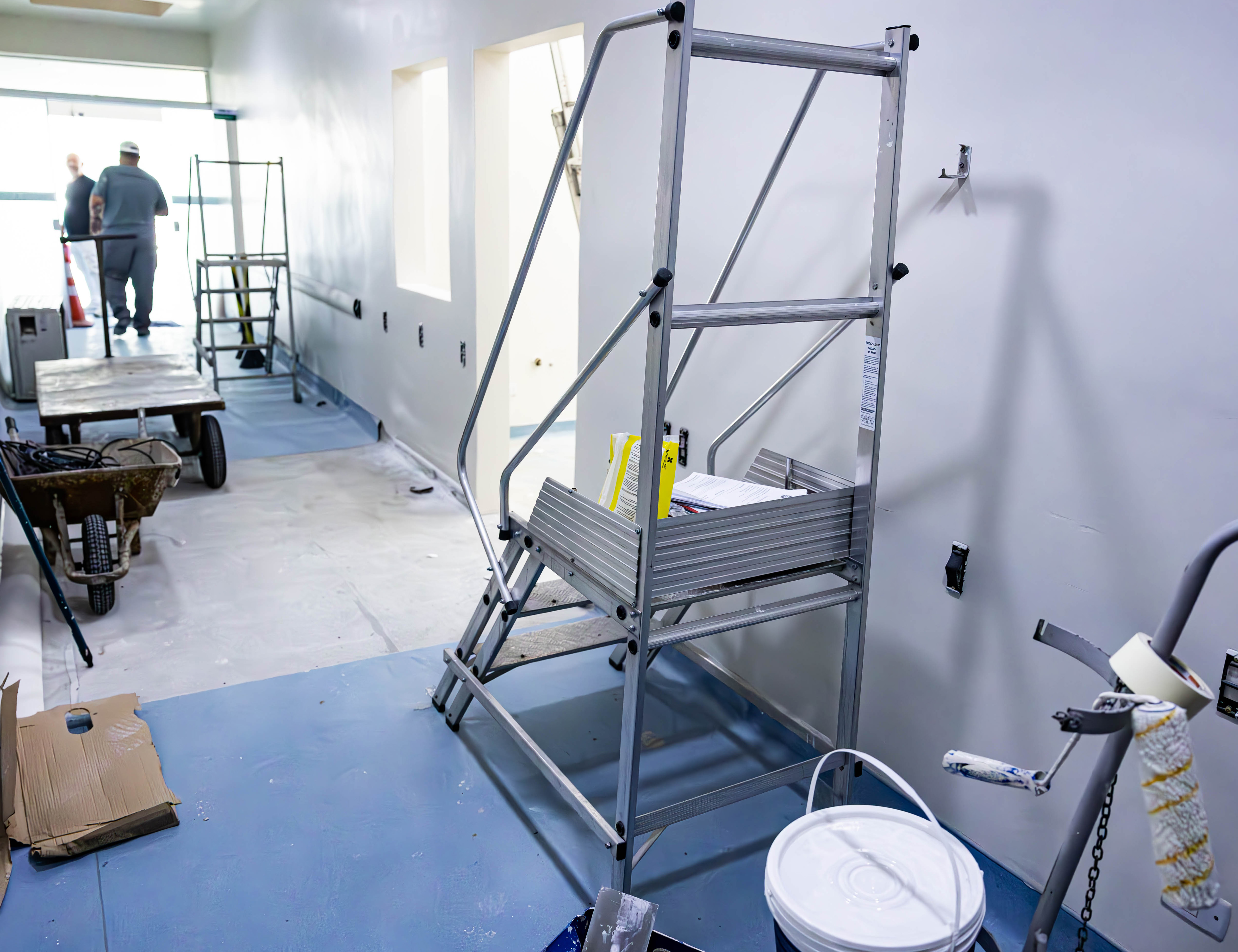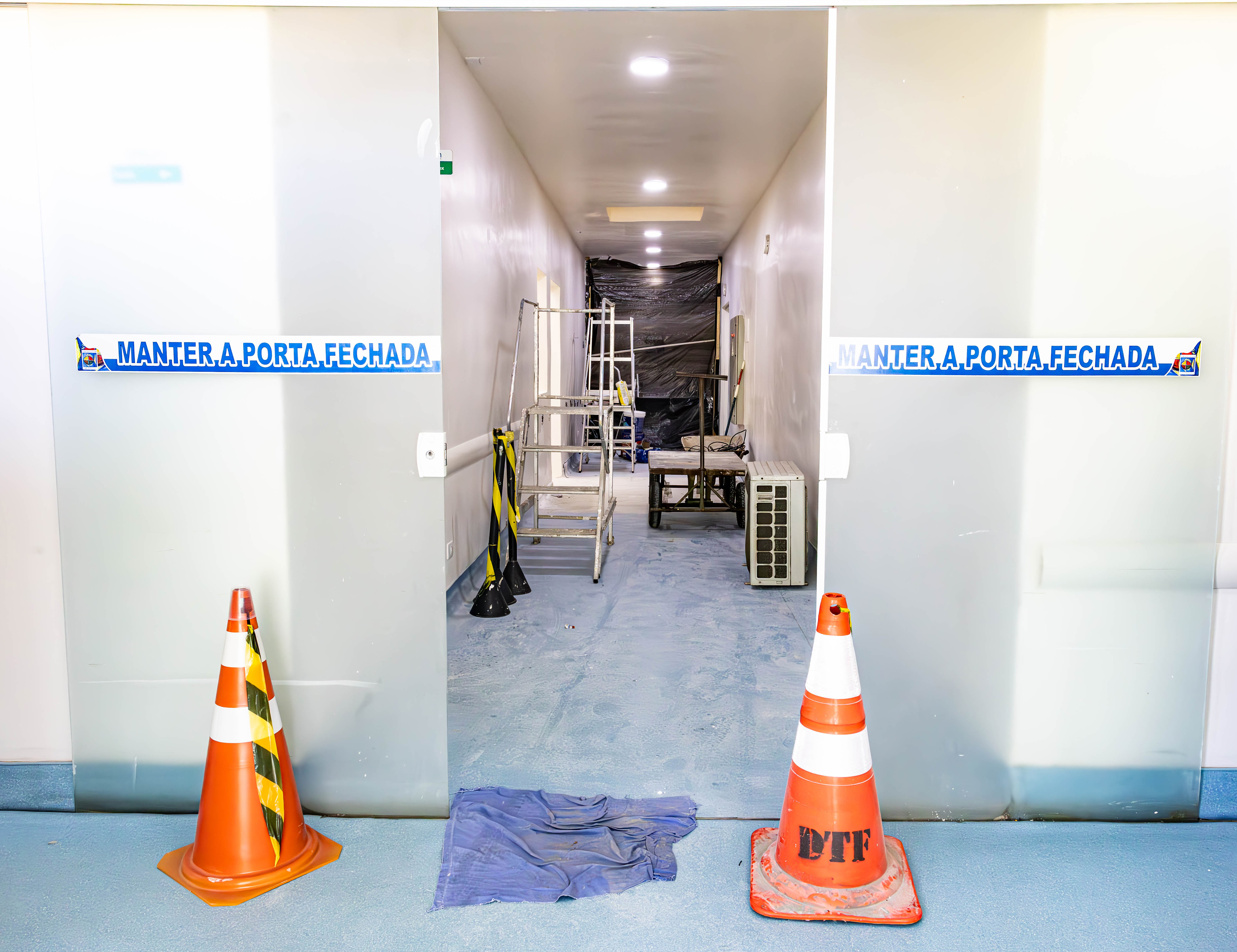 #PraTodosVerem: As imagens mostram profissionais trabalhando em obras de reforma de um prédio da saúde. Na primeira foto, um homem com luvas amarelas e boné preto aplica argamassa em uma parede. As outras imagens mostram corredores em reforma, com andaimes, latas de tinta, carrinhos e cones de sinalização. Em uma das fotos, há uma porta de vidro com o aviso “Manter a porta fechada”. Fim da descrição.