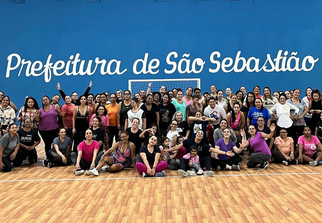 #PraTodosVerem: Duas fotos mostram grupos grandes de mulheres reunidas em um ginásio de esportes com piso de madeira e parede azul ao fundo, onde se lê “Prefeitura de São Sebastião”. Na primeira imagem, as participantes, em sua maioria vestindo roupas cor-de-rosa, posam sorrindo e levantam uma das mãos, em referência à campanha Outubro Rosa. Na segunda imagem, o grupo, ainda maior, reúne mulheres de diferentes idades e estilos de roupa, também sorrindo e demonstrando alegria e união durante uma atividade coletiva de conscientização sobre a saúde da mulher. Fim da descrição.