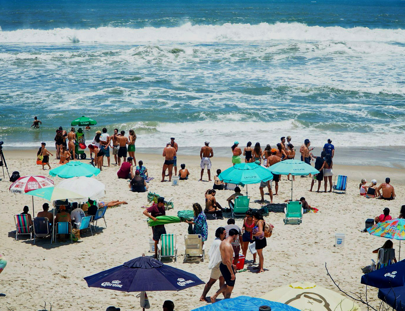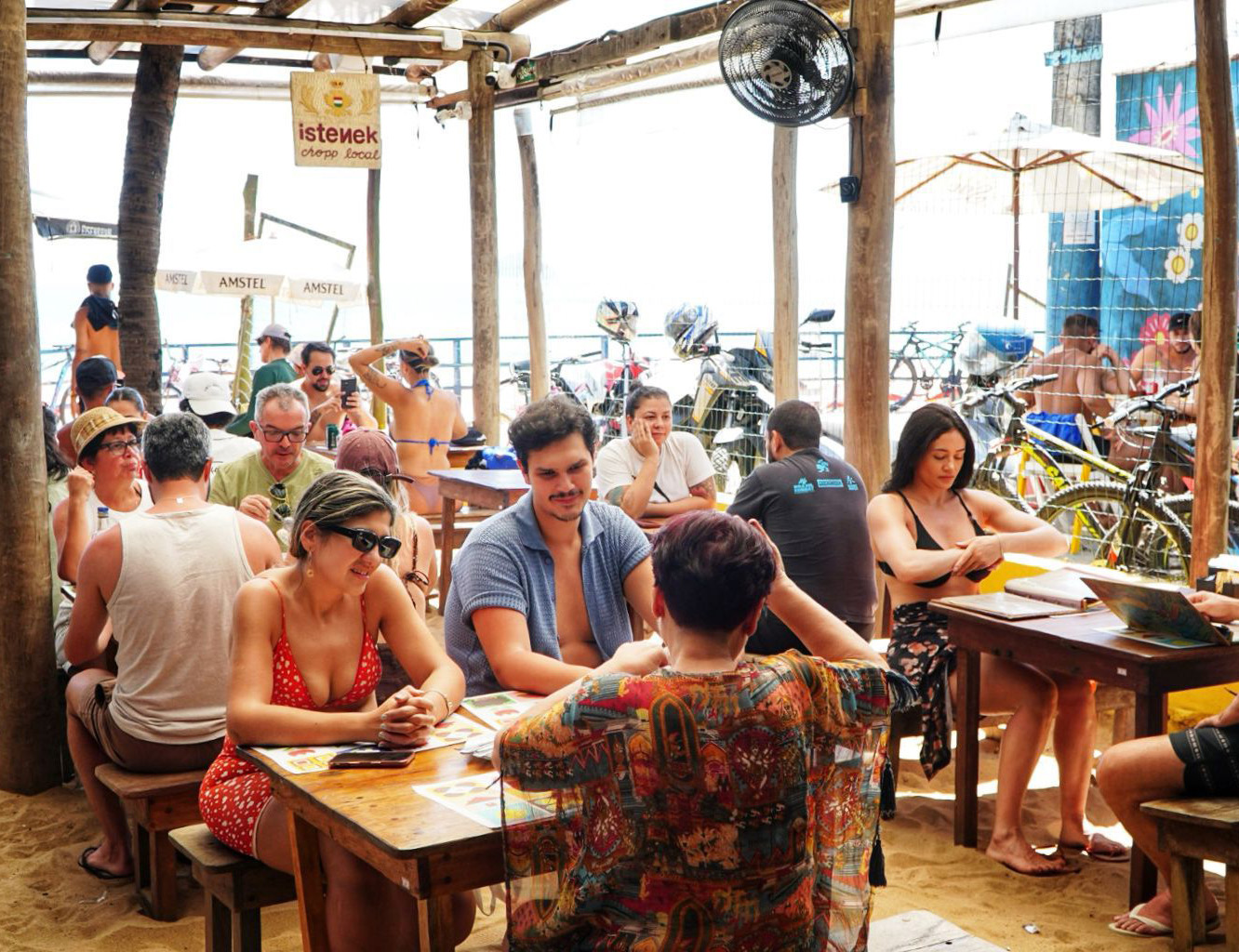 #PraTodosVerem: A primeira imagem mostra um grupo de pessoas sentadas em mesas de madeira sob uma cobertura rústica de praia, com areia no chão, conversando e relaxando. A segunda imagem é uma vista panorâmica de uma praia ensolarada e lotada, com ondas quebrando no mar e várias pessoas aproveitando a areia sob guarda-sóis coloridos. A terceira imagem foca em uma cantora loira, sorridente, vestindo uma jaqueta jeans brilhante e segurando um microfone, durante uma performance em um palco com iluminação azul. A quarta imagem exibe dois jovens, de perfil, em pé na areia da praia; um segura uma prancha de surf pequena e escura, enquanto o outro segura uma prancha mais longa e clara, com uma colina verde e densa ao fundo. Fim da descrição.