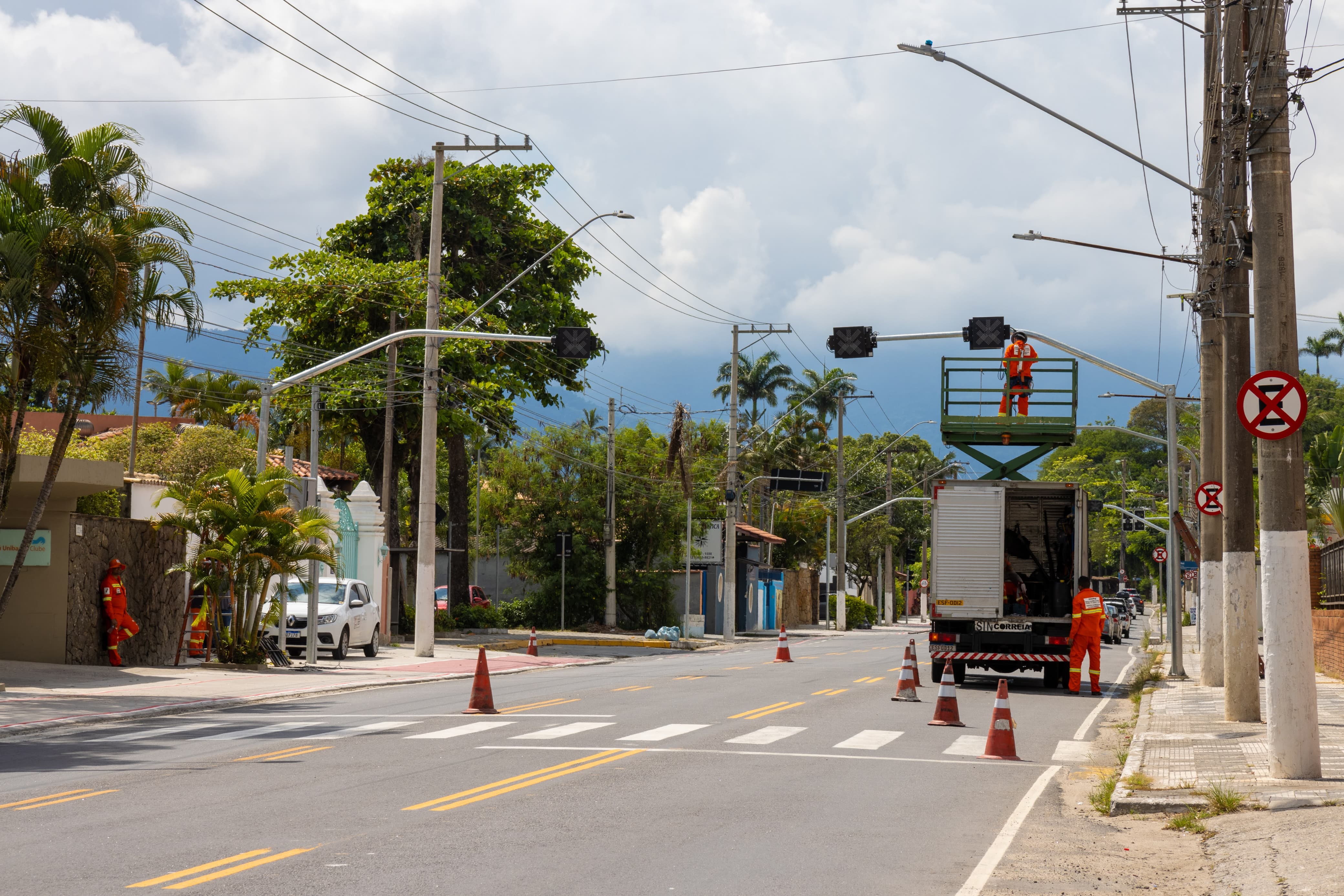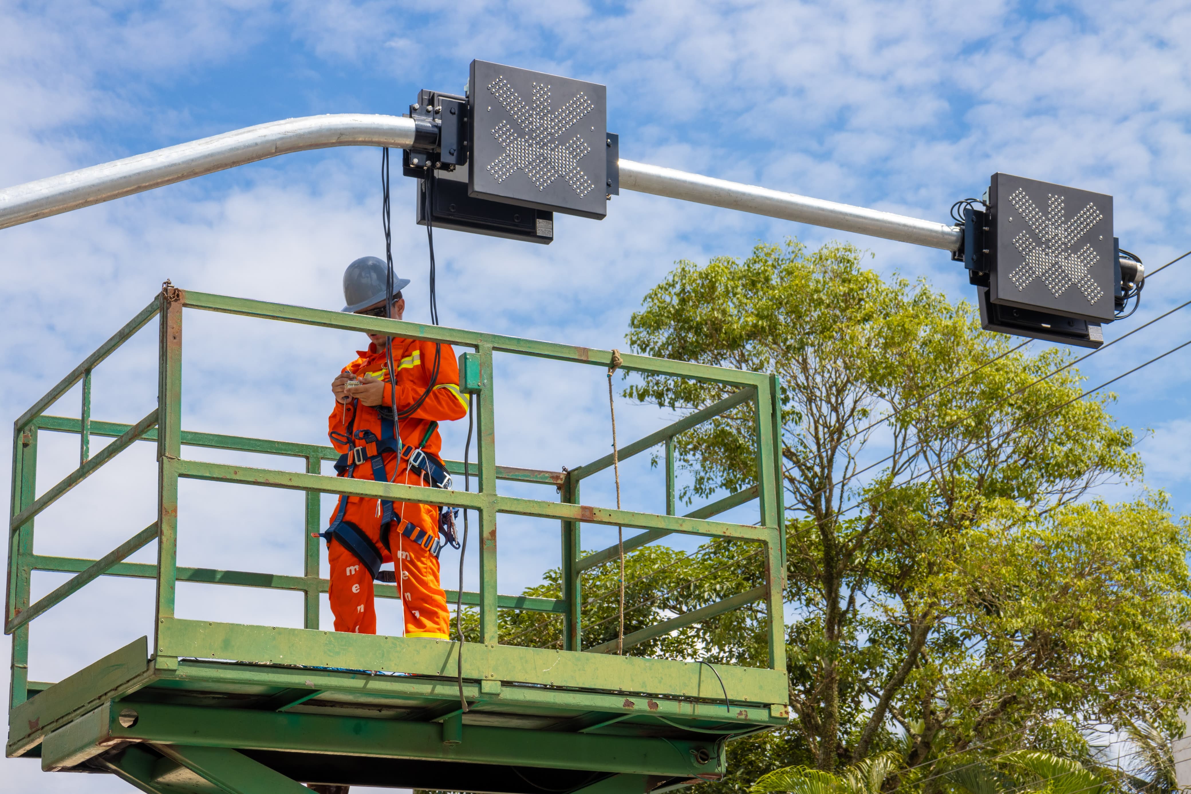 #PraTodosVerem: imagens de operários trabalhando na instalação de semáforos bidirecionais na Avenida Guarda Mor Lobo Viana. Fim da descrição.