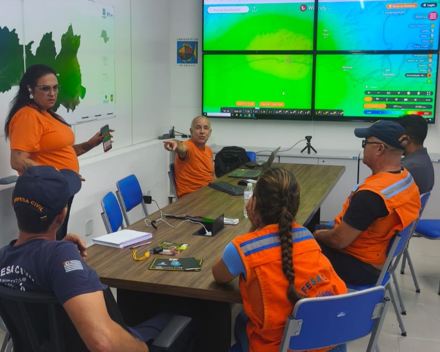 #PraTodosVerem: Agentes da Dedfesa Civil de São Sebastião reunidos no Centro de Gereanciamento de Crise. Fim da descrição.