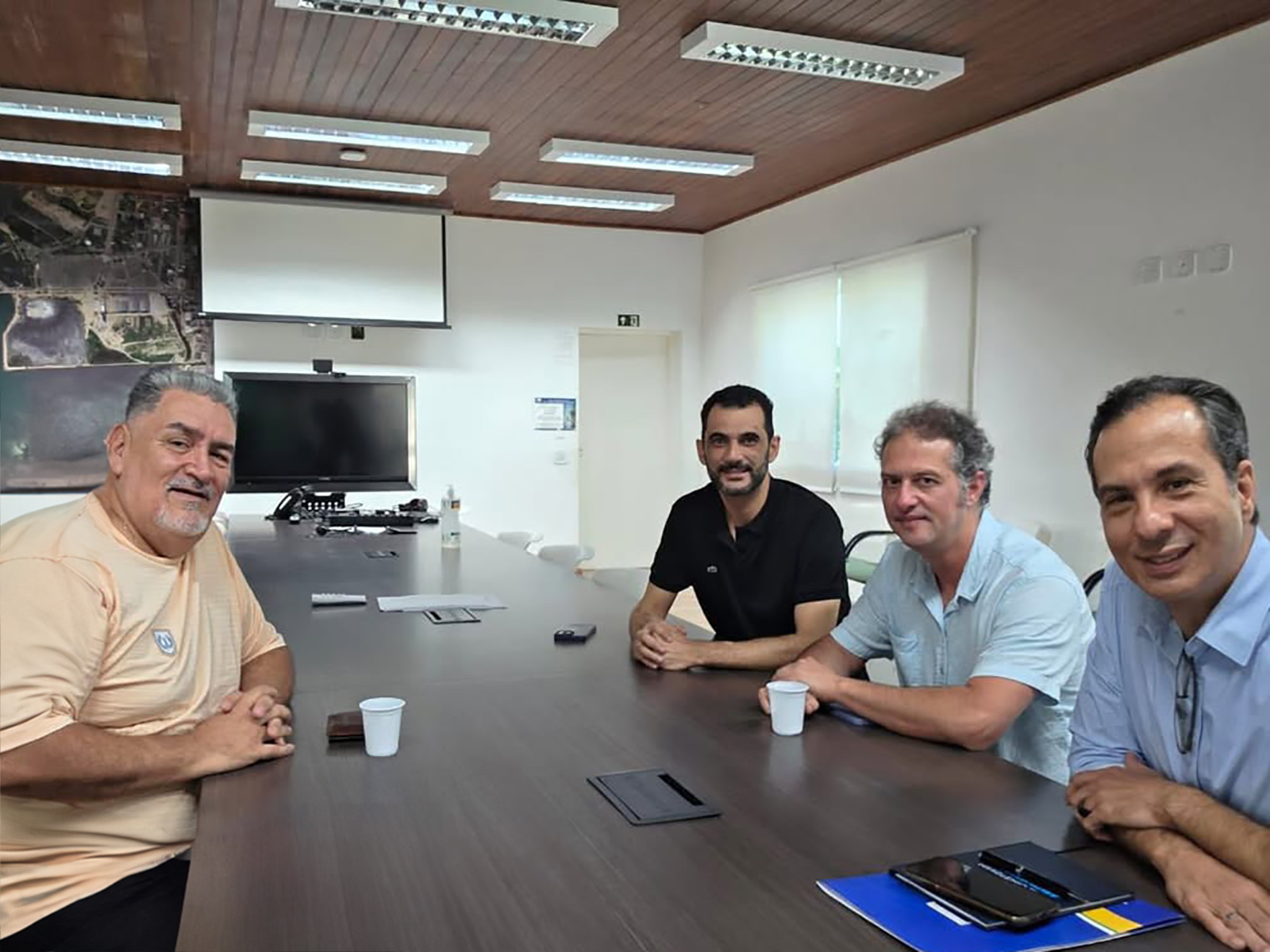 #PraTodosVerem: Quatro homens estão sentados ao redor de uma mesa de reunião retangular de madeira escura, em uma sala bem iluminada. À esquerda, um homem de pele clara, cabelo grisalho e cavanhaque usa camiseta bege e sorri para a câmera. Ao seu lado, um homem de pele morena, cabelo curto e barba usa camiseta preta. O terceiro homem tem pele clara, cabelo grisalho ondulado e veste camisa azul clara. À direita, o quarto homem tem pele clara, cabelo escuro e veste camisa azul; ele sorri levemente. Sobre a mesa há copos descartáveis brancos, um caderno azul com caneta e alguns dispositivos eletrônicos.