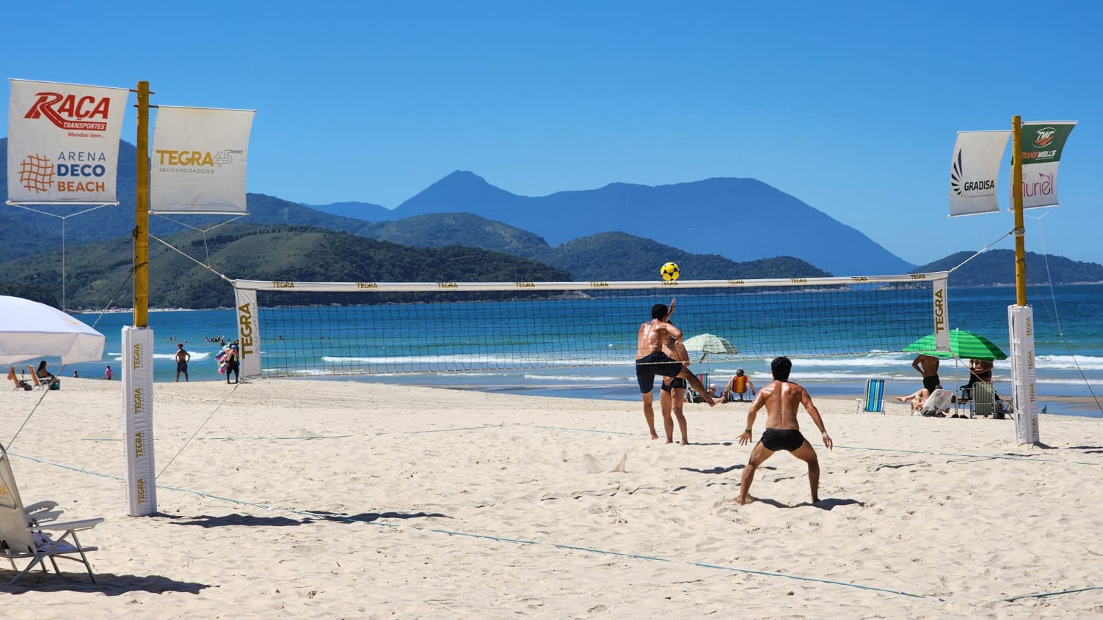 #PraTodosVerem: Duas imagens mostram momentos de uma partida de futevôlei na praia. Uma das fotos, mostra uma mulher de biquíni com estampa de onça, que está concentrada enquanto realiza um movimento com a perna para tocar a bola, com o mar azul ao fundo. Em uma outra imagem, dois homens jogam futevôlei na areia clara sob céu azul, com montanhas e o mar ao fundo. Uma rede com banners de patrocinadores, como “Tegra” e “Lito Futevôlei Maresias”, divide a quadra. Ao fundo, há pessoas curtindo a praia, algumas embaixo de guarda-sóis. Fim da descrição.