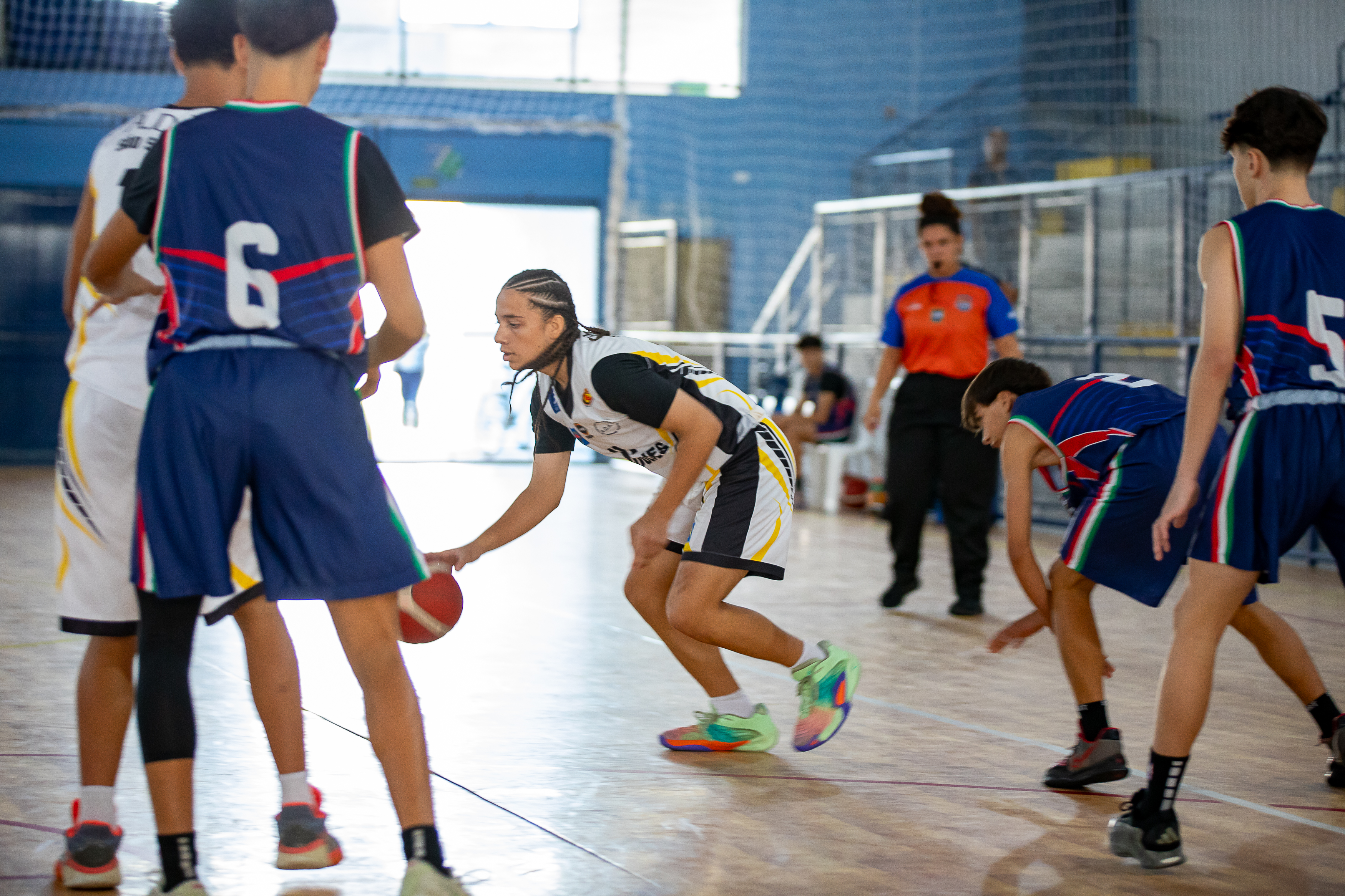 #PraTodosVerem: Atletas das equipes Wolves de São Sebastião protagonizam momentos intensos durante partidas de basquete realizadas em ginásio coberto, com destaque para o arremesso de lance livre feminino, jogadas de drible e disputa de bola no início da partida masculina, sempre acompanhadas por árbitros atentos. Fim da descrição.
