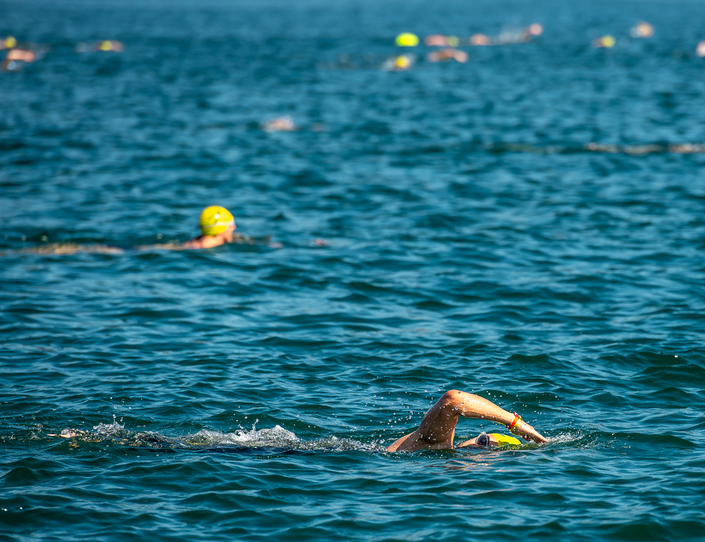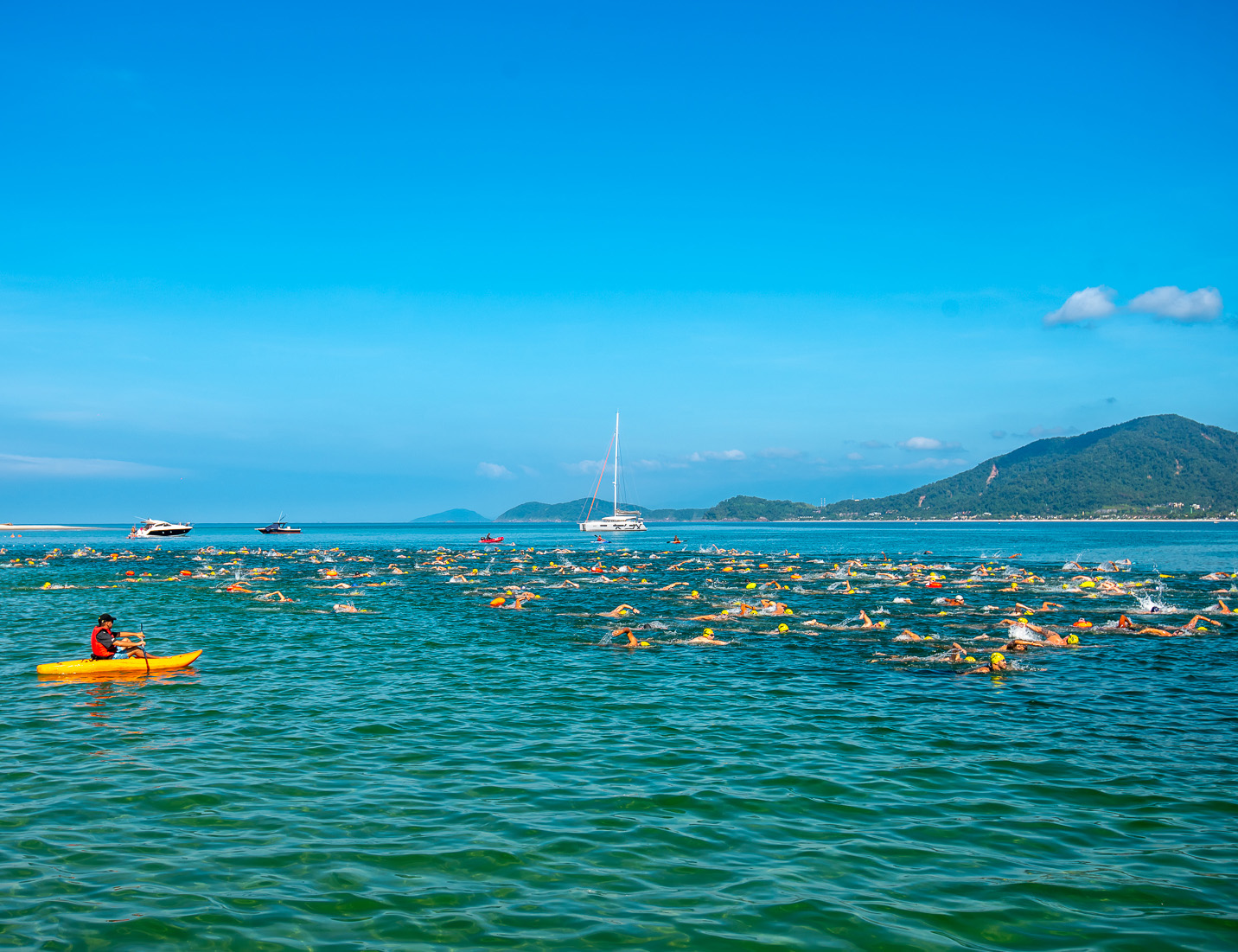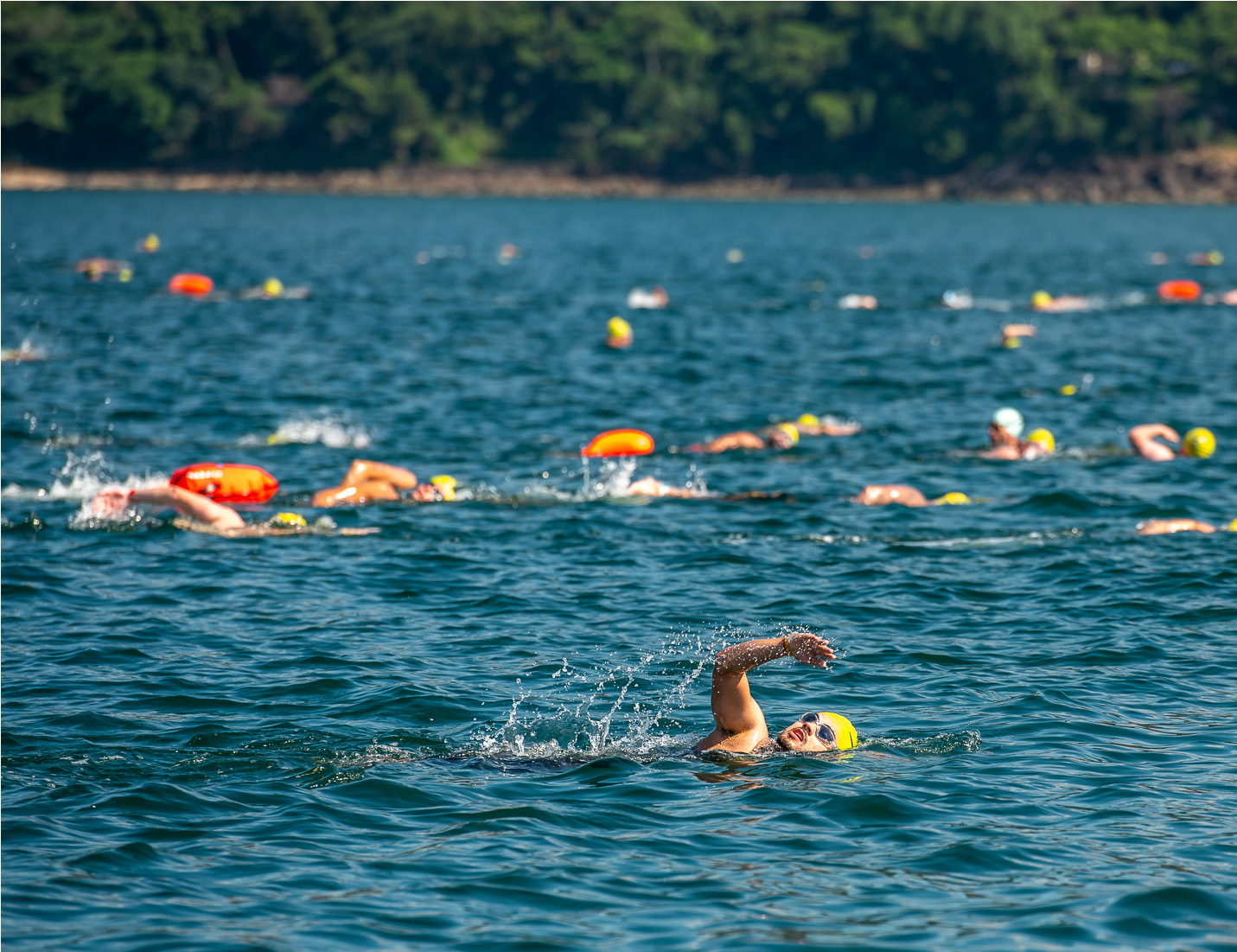#PraTodosVerem: As imagens mostram dezenas de nadadores em ação durante diferentes edições da prova Fuga das Ilhas, avançando pelo mar azul em meio à paisagem paradisíaca de São Sebastião, com boias coloridas de segurança acompanhando cada participante; em uma cena mais aberta, barcos de apoio e um caiaque observam e orientam o trajeto, enquanto, em outras, o foco se aproxima dos atletas que cortam a água com braçadas firmes, rostos concentrados, óculos e toucas, enfrentando ondulações. Fim da descrição.