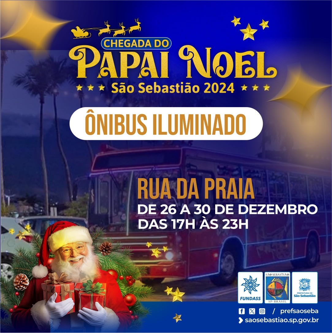 De 26 a 30 de dezembro, das 17h às 23h, a Prefeitura de São Sebastião, por meio da Secretaria de Turismo (SETUR) e da Fundação Educacional e Cultural ‘Deodato Sant’Anna’ (Fundass), oferecerá uma encantadora experiência natalina na cidade com o Ônibus Iluminado.