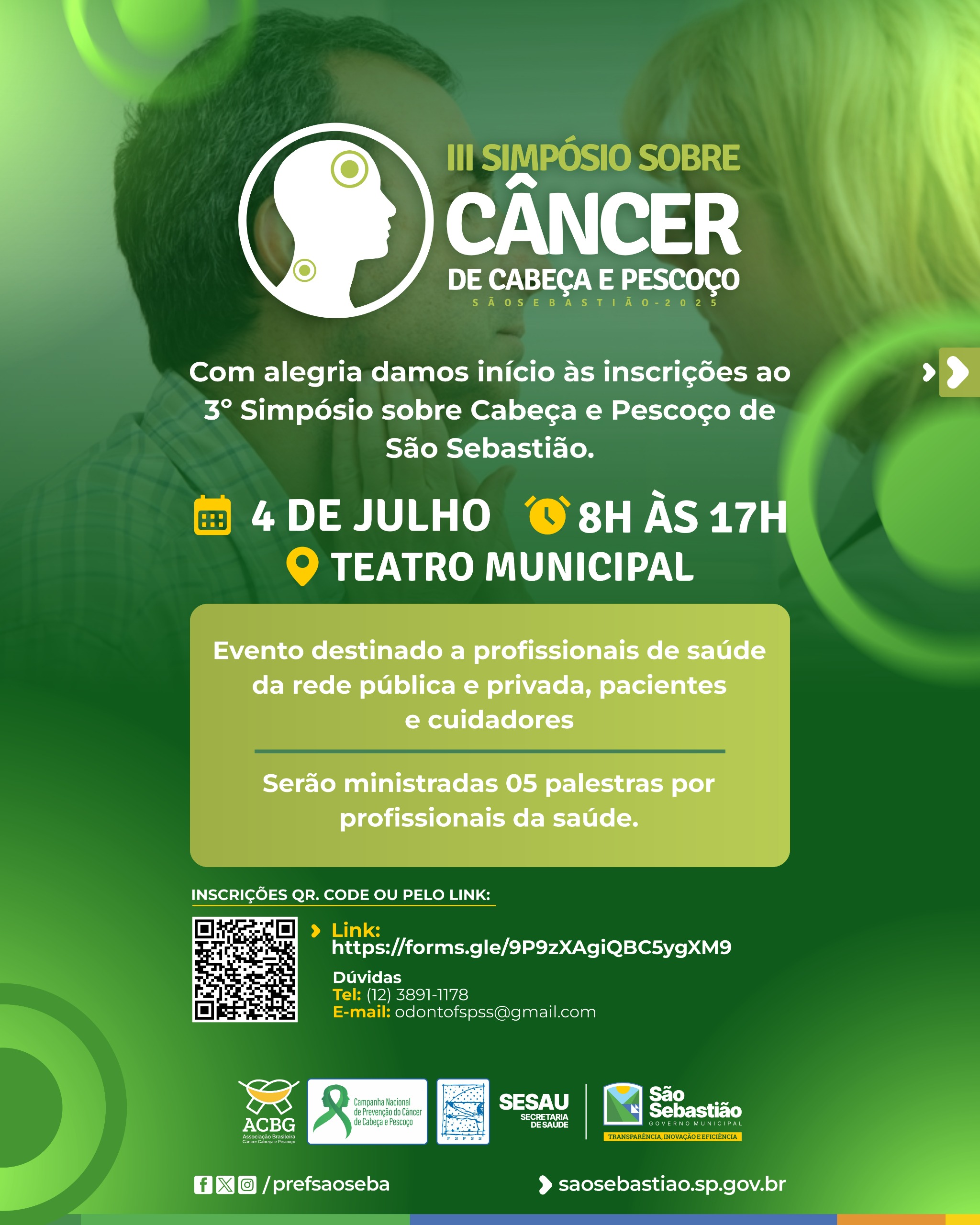 A Prefeitura de São Sebastião, por meio da Secretaria de Saúde (Sesau) e da Fundação de Saúde Pública (FSPSS), abriu no dia 27 de maio o período de inscrições do 3º Simpósio sobre Câncer da Cabeça e Pescoço, que ocorrerá no dia 4 de julho, no Teatro Municipal, das 8h às 17h. O evento é destinado a profissionais de saúde da rede pública e privada, pacientes e também cuidadores.
