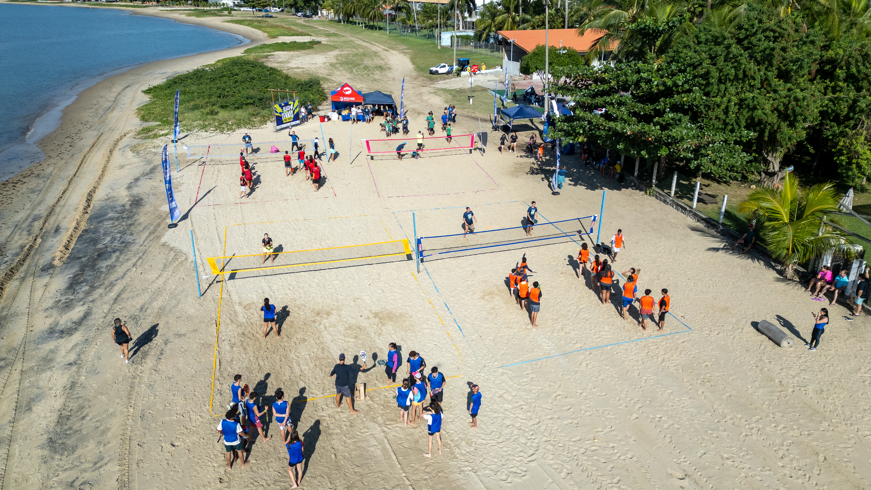 A programação começou com a acolhida dos alunos, distribuição de pulseiras de identificação, lanches e organização das equipes. Em seguida, os participantes foram divididos por cores de coletes e direcionados às quadras, onde professores especializados conduziram oficinas práticas sobre beach tennis, ensinando noções básicas como movimentação, saque e trabalho em equipe.