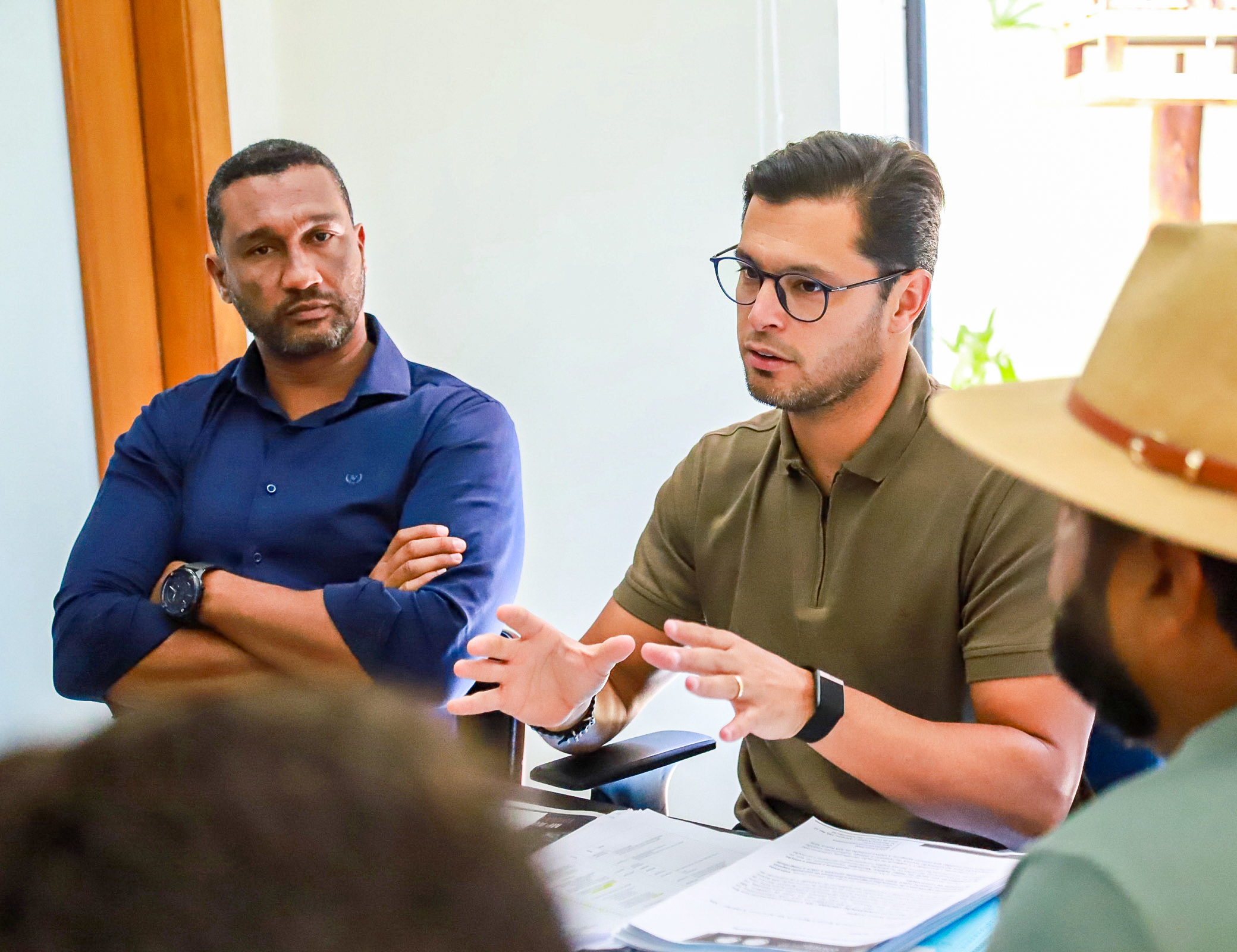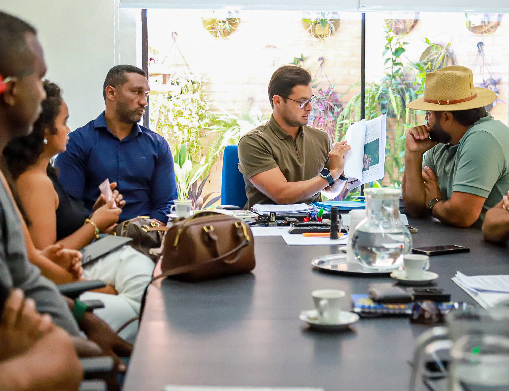 #PraTodosVerem: imagens na sala de reunião do gabinete conta com a presença do prefeito Reinaldinho Moreira, secretários e moradores da Barreirinha. Fim da descrição.