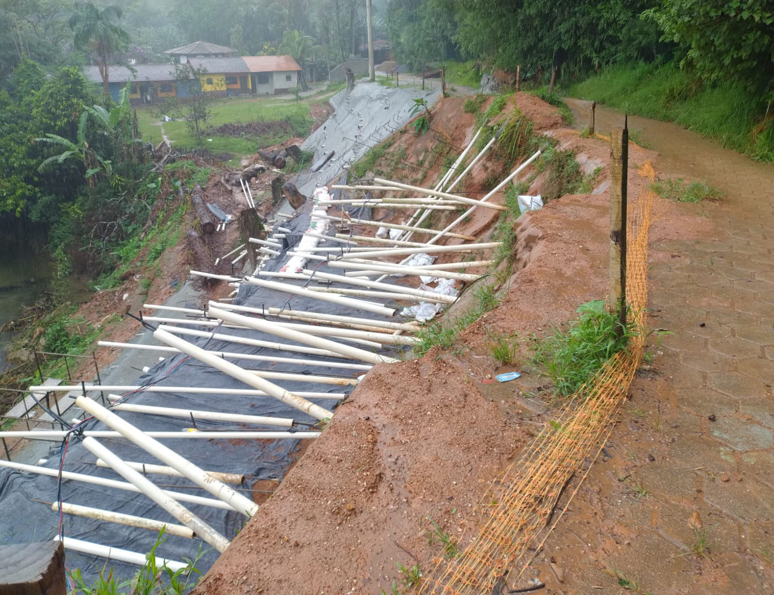 A obra de contenção definitiva de talude e recuperação da infraestrutura viária da Estrada Beira Rio, iniciada após os danos causados pela tragédia de 19 de fevereiro de 2023, também foi impactada pelas chuvas do último domingo, com registro de escorregamento de terra e queda de árvore.