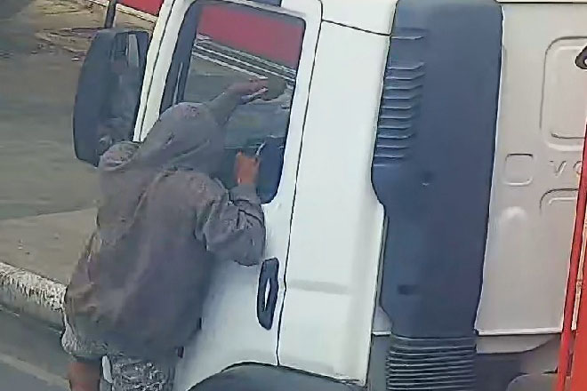 #PraTodosVerem: Imagem mostra um caminhão de entrega com a carroceria vermelha estacionado em uma rua. Um homem de bermuda estampada, casaco com capuz e sandálias está escalando a lateral do veículo, apoiado no estribo, com uma mão segurando a porta e a outra próxima ao vidro da cabine do motorista. O homem coloca a cabeça pra dentro e retira aparelho celular do interior do caminhão pela janela. Ao fundo, há uma calçada de cimento e a fachada de um comércio com paredes vermelhas e brancas. Fim da descrição.