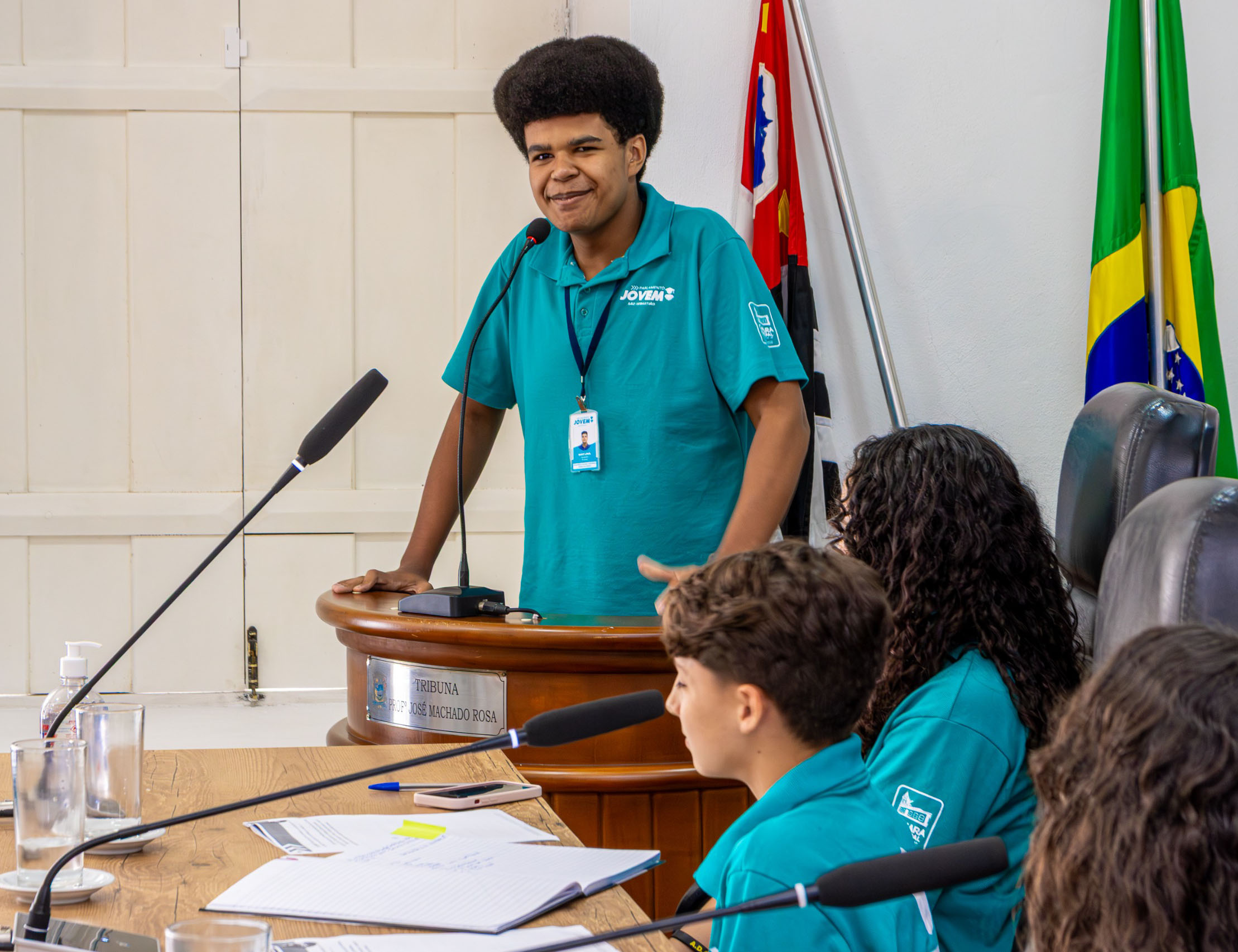O evento aderiu aos protocolos usuais das sessões da Câmara de São Sebastião, com os jovens vereadores entoando os hinos nacional e municipal.