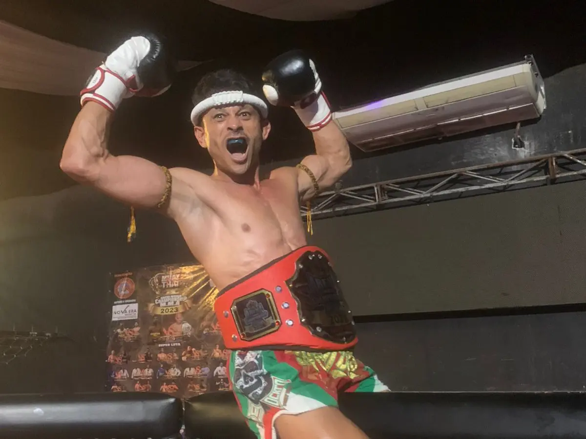 #PraTodosVerem: fotos do atleta sebastianense Manoel Damasceno, o “Alan Du Bugre”, durante luta de Muay Thai. Fim da descrição.
