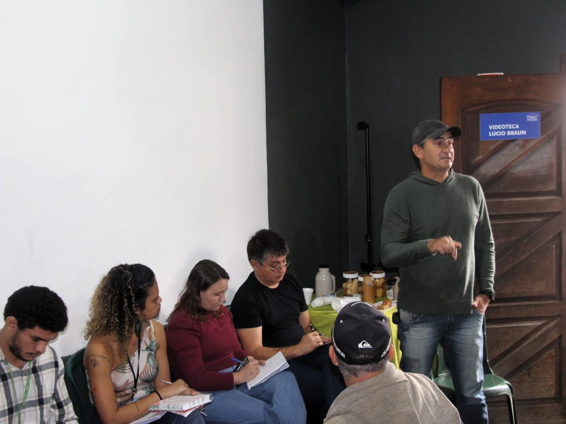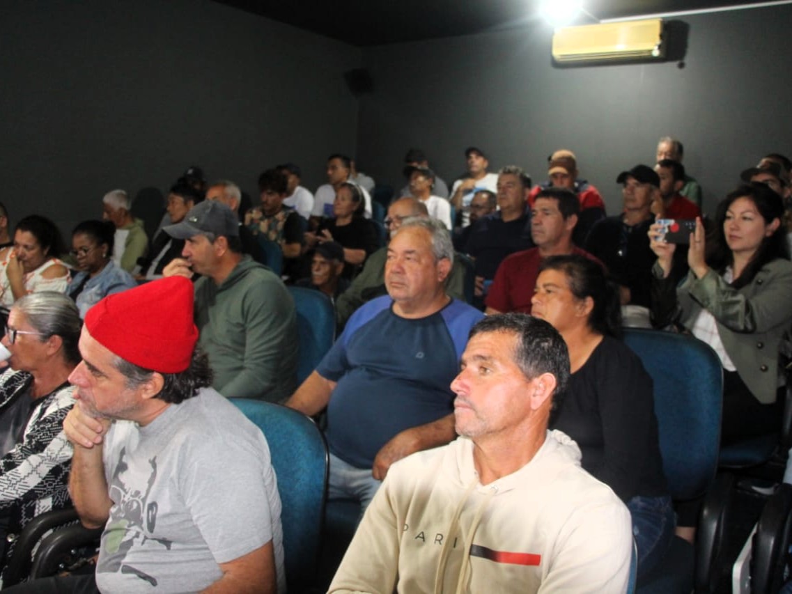 #PraTodosVerem: fotos do encontro regional do Grupo de Trabalho (GT) da Tainha do Ministério da Pesca e Aquicultura (MPA), que foi realizada na Videoteca Lúcio Braun, em Caraguatatuba. As imagens mostram o grupo de pescadores atentos a reunião. Fim da descrição.