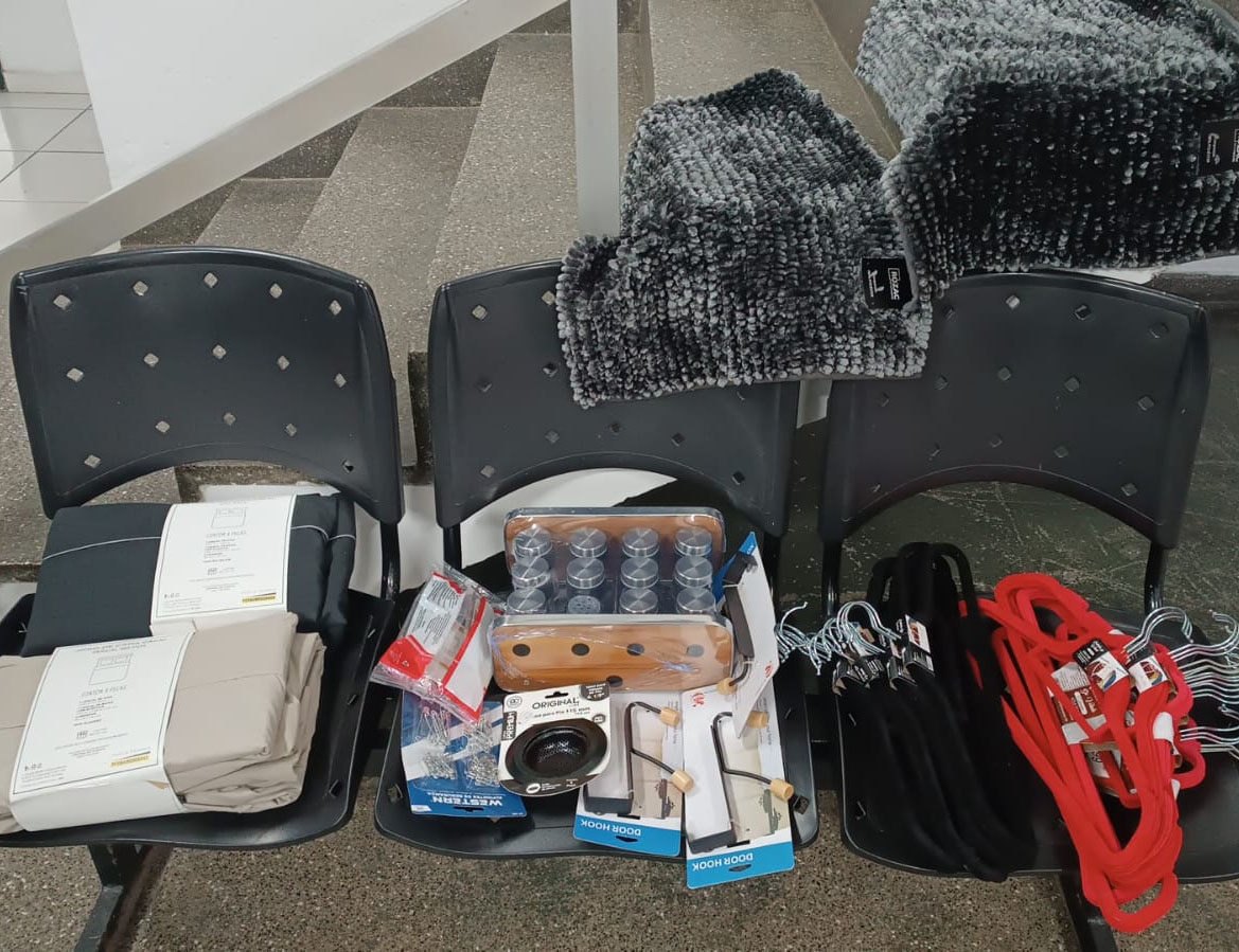 Conforme registro na Delegacia de Polícia, foram pelo menos oito estabelecimentos comerciais por onde ela teria passado. Com ela, foram encontrados cabides de roupas, jogos de lençóis, tapetes, utensílios de cozinha, resistência de chuveiro, ralo de pia, caixa de agulhas, ganchos de parede, suporte de tempero, entre outros.
