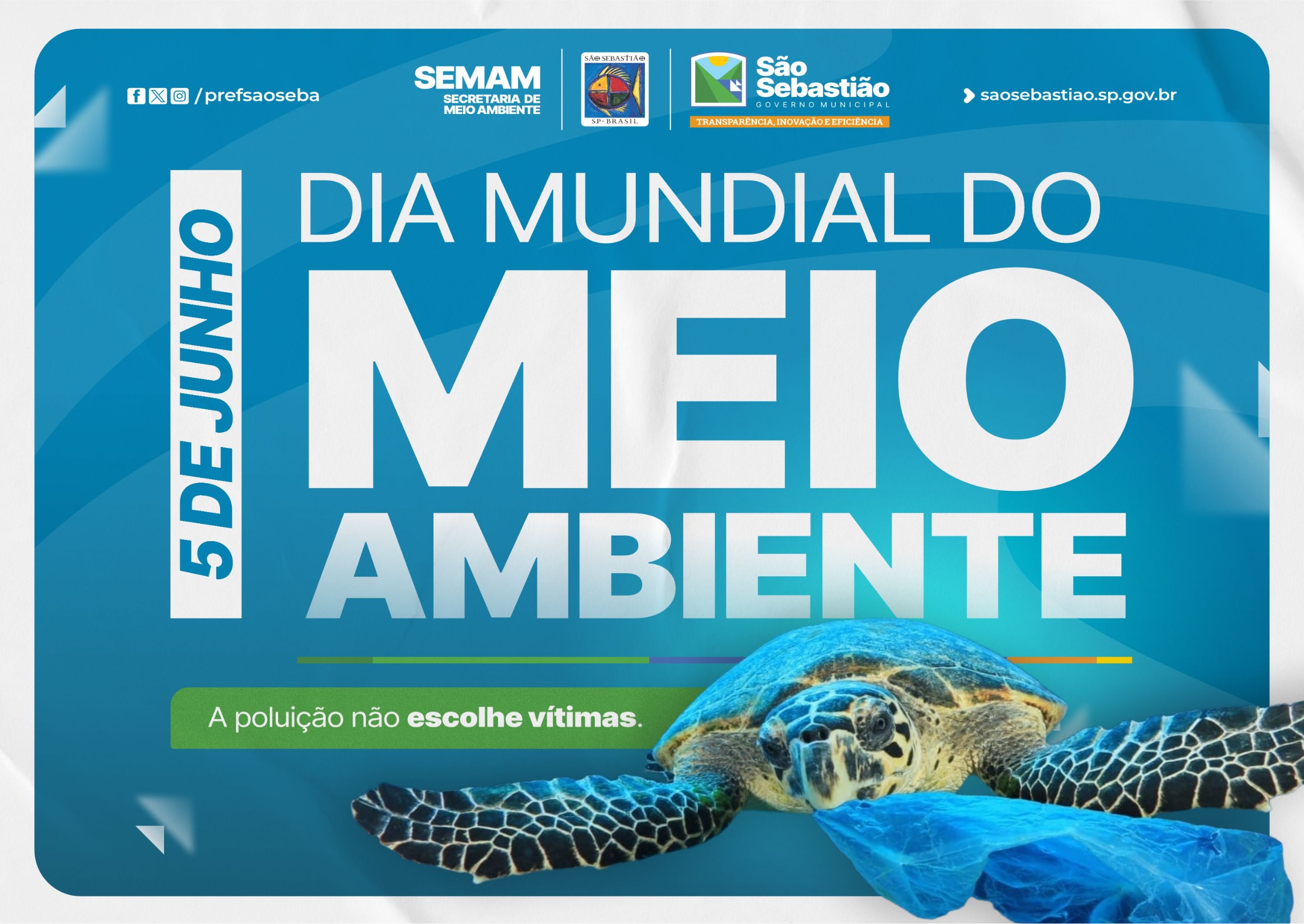 #PraTodosVerem: imagem digital em tons de azul com o título "Dia Mundial do Meio Ambiente" em letras grandes e brancas. À esquerda, uma faixa vertical indica a data: "5 de junho". Na parte inferior, aparece uma tartaruga-marinha nadando com um saco plástico preso à nadadeira. Acima da tartaruga, está escrito: "A poluição não escolhe vítimas." No topo da imagem, há logotipos da Prefeitura de São Sebastião, da Semam (Secretaria de Meio Ambiente), do Governo Municipal e o site oficial da prefeitura.