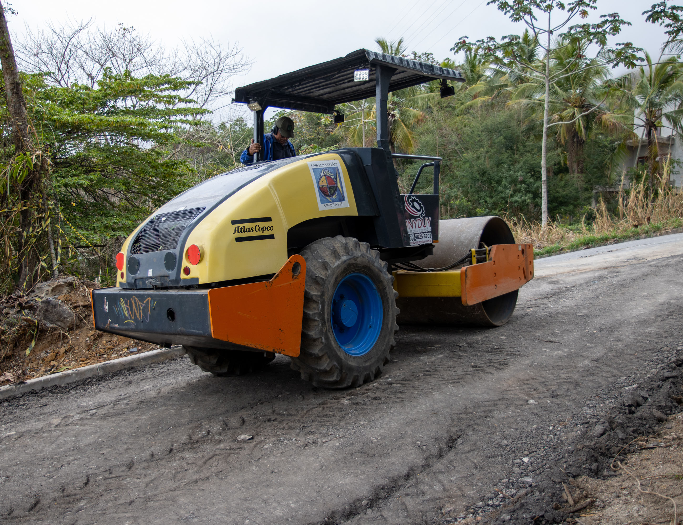 #ParaTodosVerem: As imagens mostram uma máquina compactadora atuando na pavimentação da Rua João Aniceto, no bairro São Francisco. O equipamento de cor amarela, com detalhes em laranja e azul, aparece em diferentes ângulos enquanto realiza o serviço sobre o solo da via, cercada por vegetação e casas ao fundo. Fim da descrição.