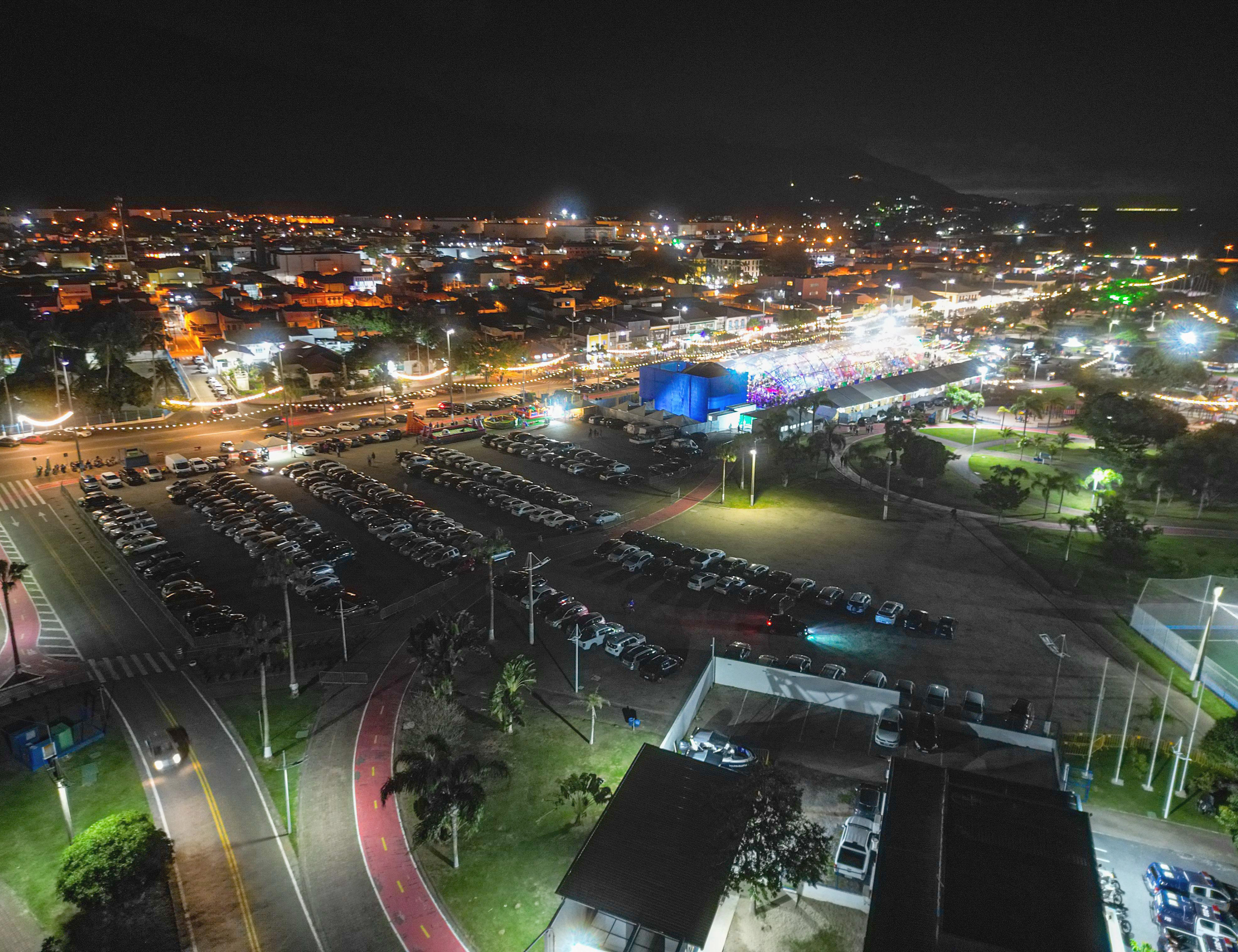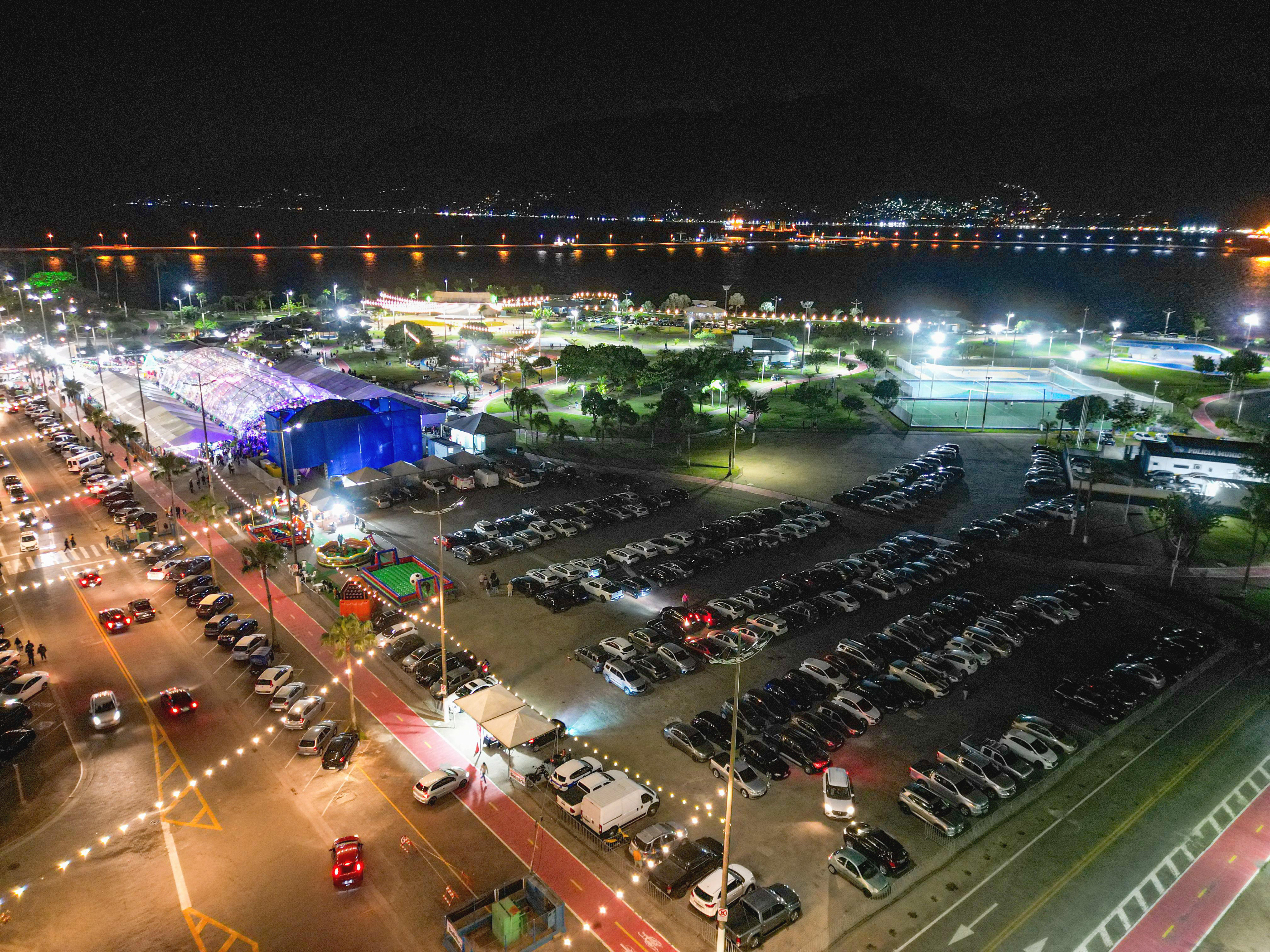 #PraTodosVerem: Imagens aéreas noturnas mostram uma grande área urbana iluminada. Em primeiro plano, há um amplo estacionamento repleto de carros organizados em filas, ladeado por ciclovia e vias bem iluminadas. Ao fundo, observa-se uma estrutura coberta por lona azul e um espaço com arquibancadas repletas de pessoas, com luzes coloridas indicando a realização de um evento festivo. Na segunda imagem, o mesmo local é visto de outro ângulo, revelando o mar refletindo as luzes da cidade ao fundo, além de áreas esportivas iluminadas e ruas com trânsito intenso e decoração luminosa, compondo uma cena vibrante e movimentada. Fim da descrição.