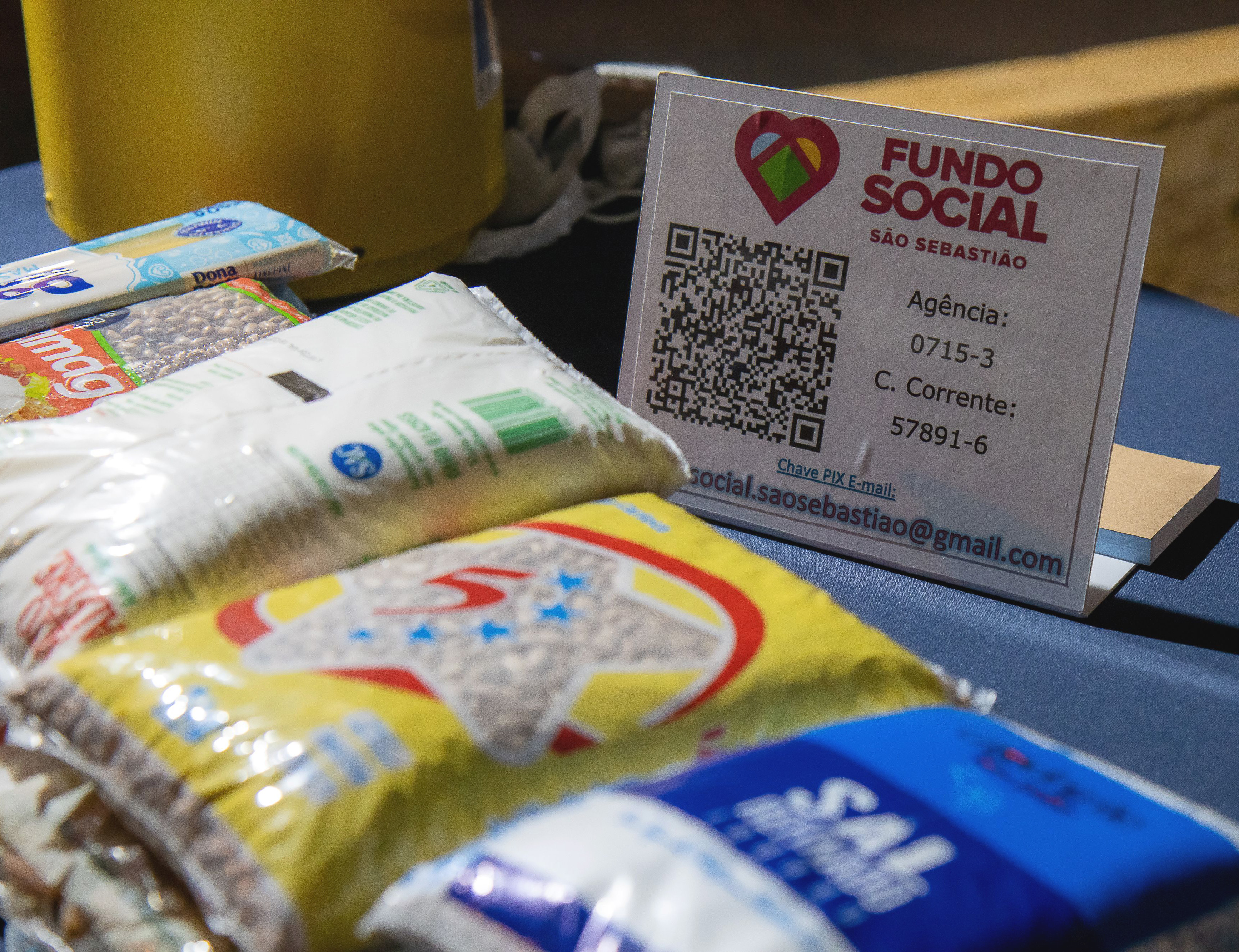 #PraTodosVerem: Em uma mesa coberta por tecido azul, há pacotes de alimentos como arroz, feijão, macarrão e sal empilhados em primeiro plano; ao fundo, um suporte exibe um cartão do Fundo Social de São Sebastião com logotipo em formato de coração, QR Code para doações, dados bancários e e-mail para chave Pix. Fim da descrição.