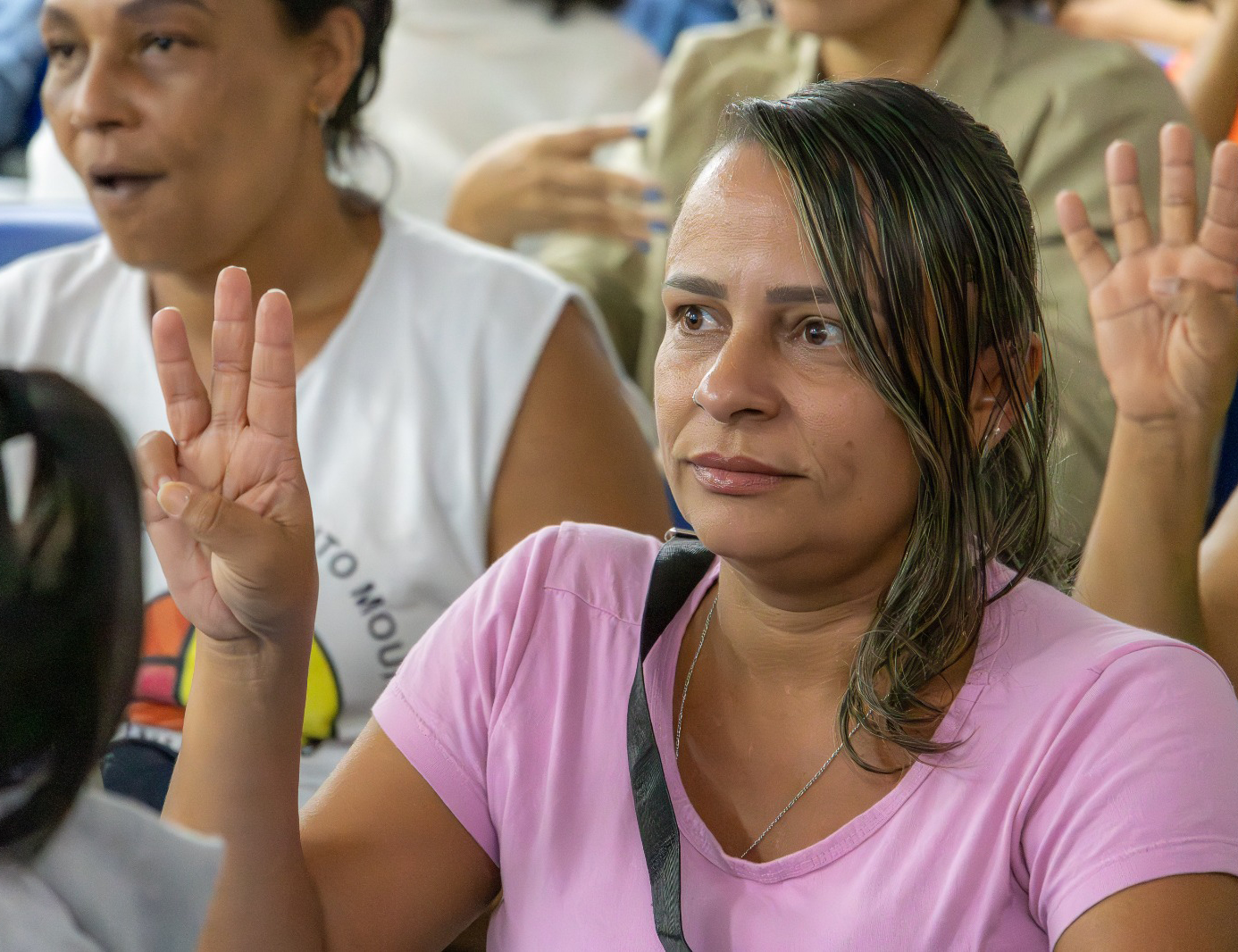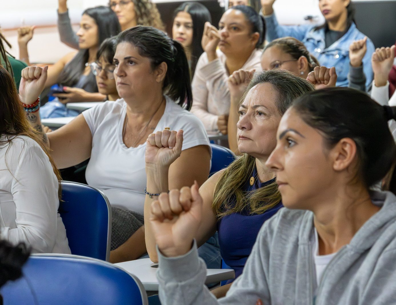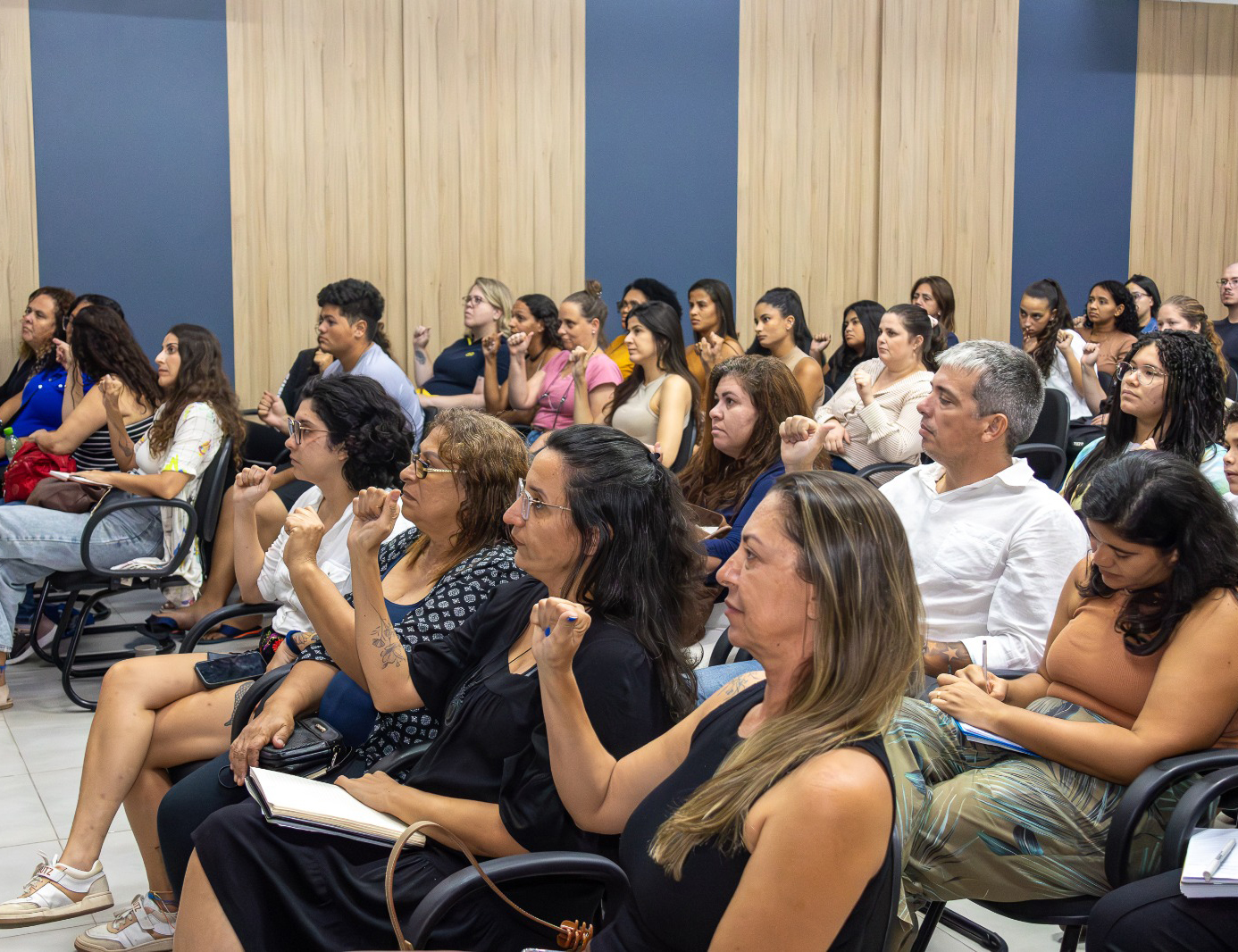 #PraTodosVerem: O conjunto de quatro fotos registra um curso de capacitação em Libras para um público majoritariamente feminino em um auditório. Na primeira imagem, uma instrutora com blusa preta está em pé à frente da sala, sinalizando com as mãos enquanto sorri. As demais fotos mostram as participantes sentadas em fileiras, observando atentamente e replicando os sinais com as mãos levantadas, como o sinal de "A" (punho fechado) e numerais. O ambiente é iluminado, com paredes em tons de azul e madeira, transmitindo um clima de aprendizado e engajamento coletivo.