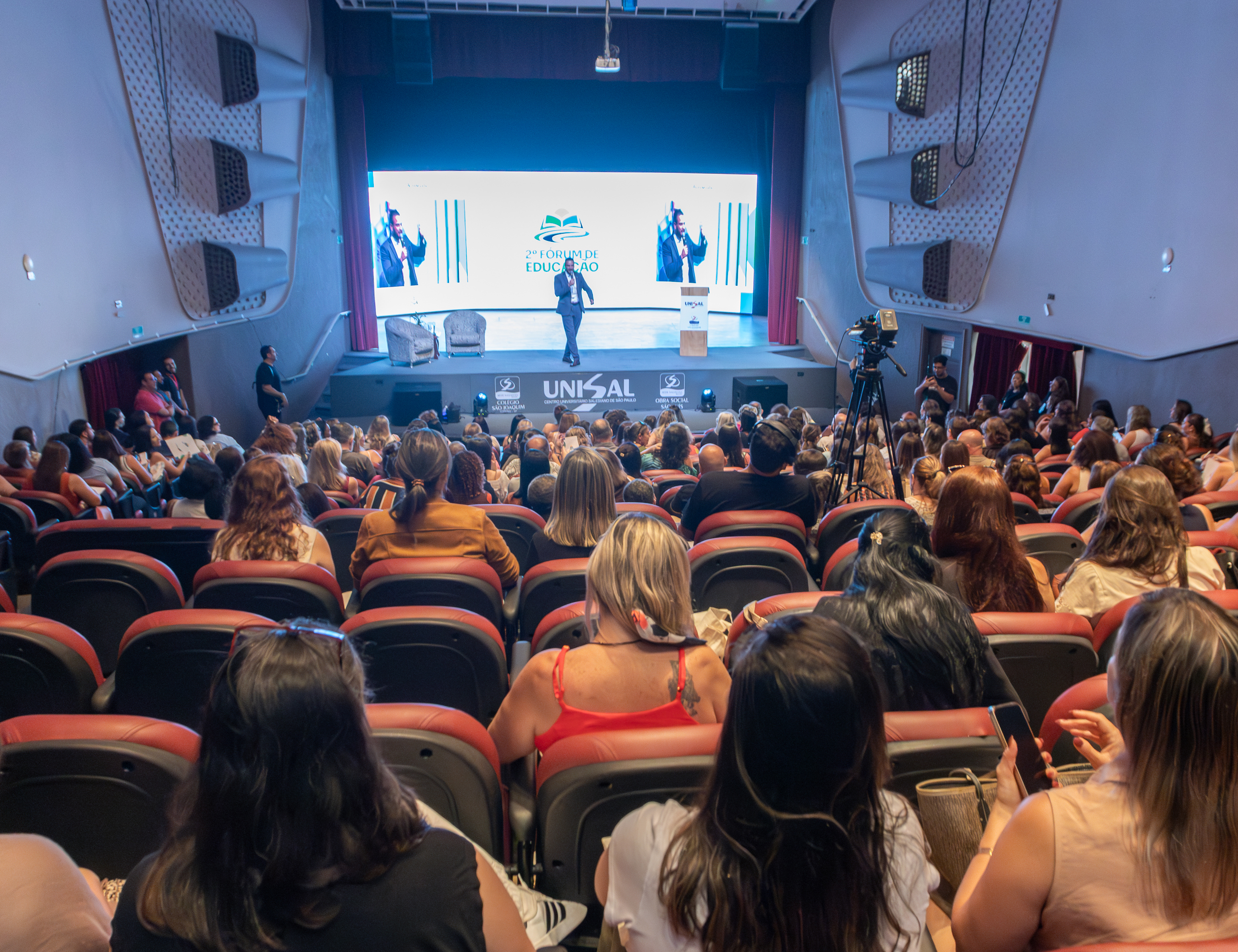 #PraTodosVerem: As imagens registram o 2º Fórum de Educação na Unisal, com auditório cheio, público atento, palestrantes no palco e transmissão ao vivo em telão. Também mostram momentos de reconhecimento, com entrega de homenagens a profissionais, em ambiente institucional voltado à educação. Fim da descrição.