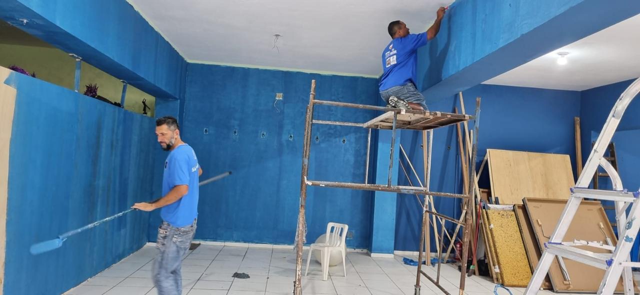 #ParaTodosVerem: imagens da equipe da Prefeitura efetuando manutenção no Salão Multiuso do CAE da Vila Amélia. Fim da descrição.