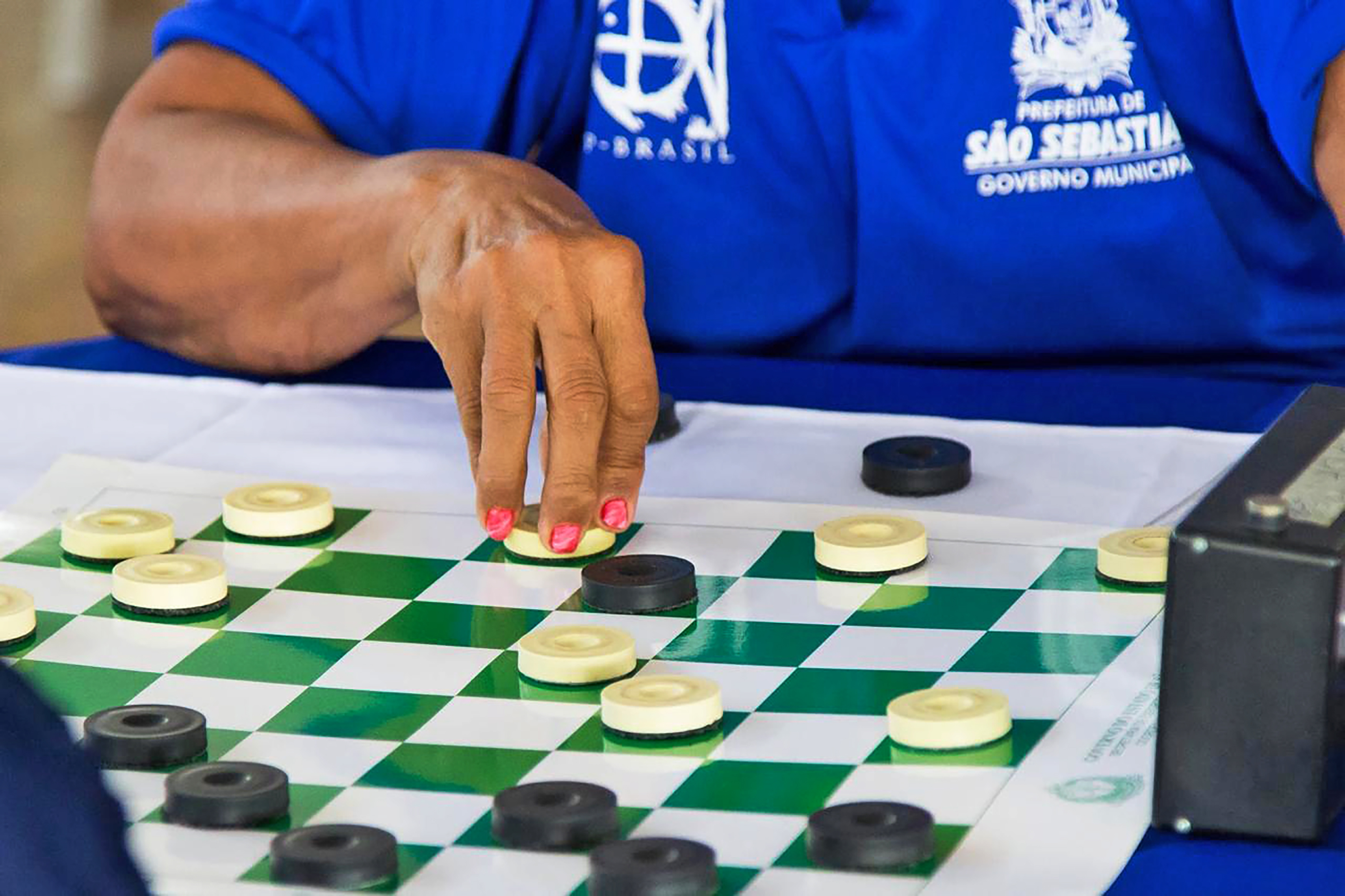 #PraTodosVerem: Quatro imagens mostram momentos de diferentes modalidades nos Jogos Regionais. Na primeira, atletas disputam uma partida de vôlei masculino em quadra coberta, com o jogador do time de branco e azul se preparando para atacar, enquanto dois adversários de azul tentam bloquear. A segunda imagem mostra duas idosas em uma partida de damas, concentradas, vestindo uniformes esportivos azul-escuros da delegação de São Sebastião. A terceira foto é um close nas mãos de uma jogadora movimentando as peças pretas e brancas sobre o tabuleiro quadriculado verde e branco. Já a quarta imagem mostra uma partida de futsal juvenil: dois jogadores de São Sebastião com uniforme azul estão com a bola no centro da quadra, enquanto o time adversário, com uniformes amarelos, está posicionado ao fundo. Fim da descrição.