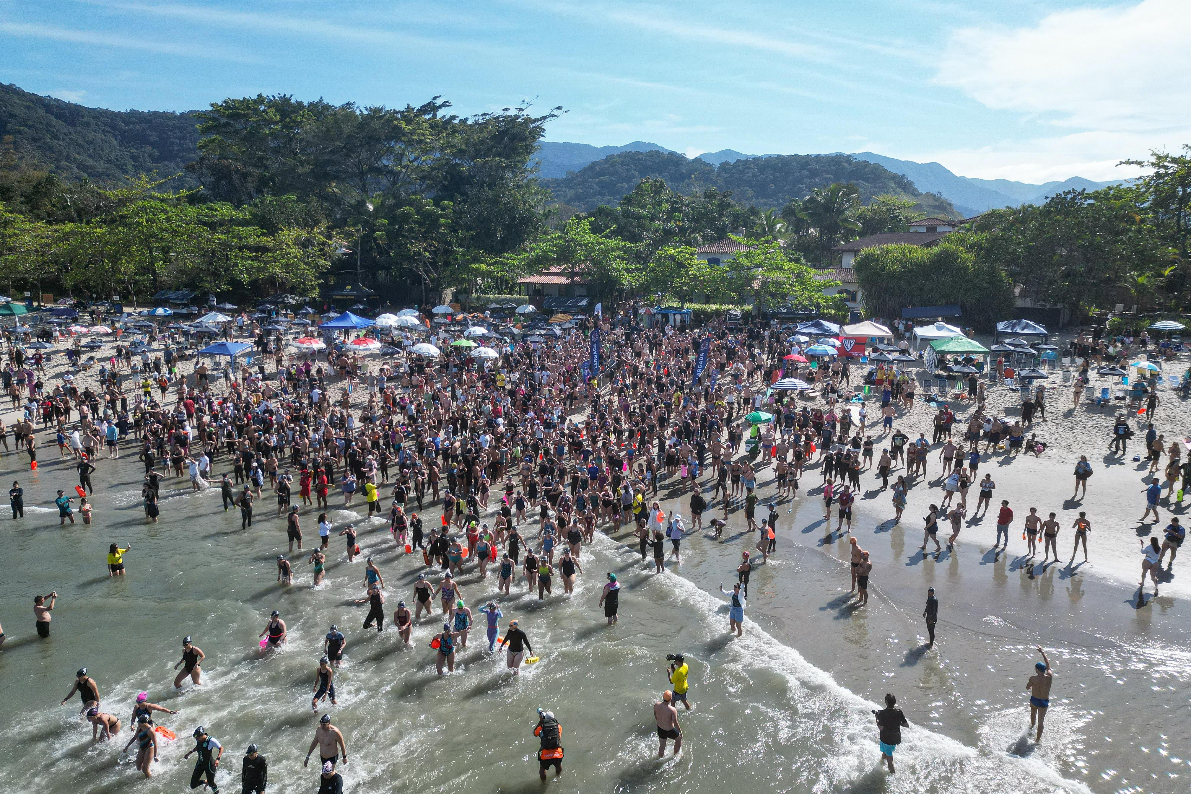 #PraTodosVerem: As imagens registram momentos do Desafio Speedo em Barra do Sahy, em São Sebastião, reunindo atletas e amantes da natação em águas abertas. Os cliques mostram desde a intensidade dos nadadores em ação no mar, passando pela emoção da premiação com os vencedores exibindo seus troféus, até a concentração dos competidores recebendo instruções na areia antes da largada. Fim da descrição.