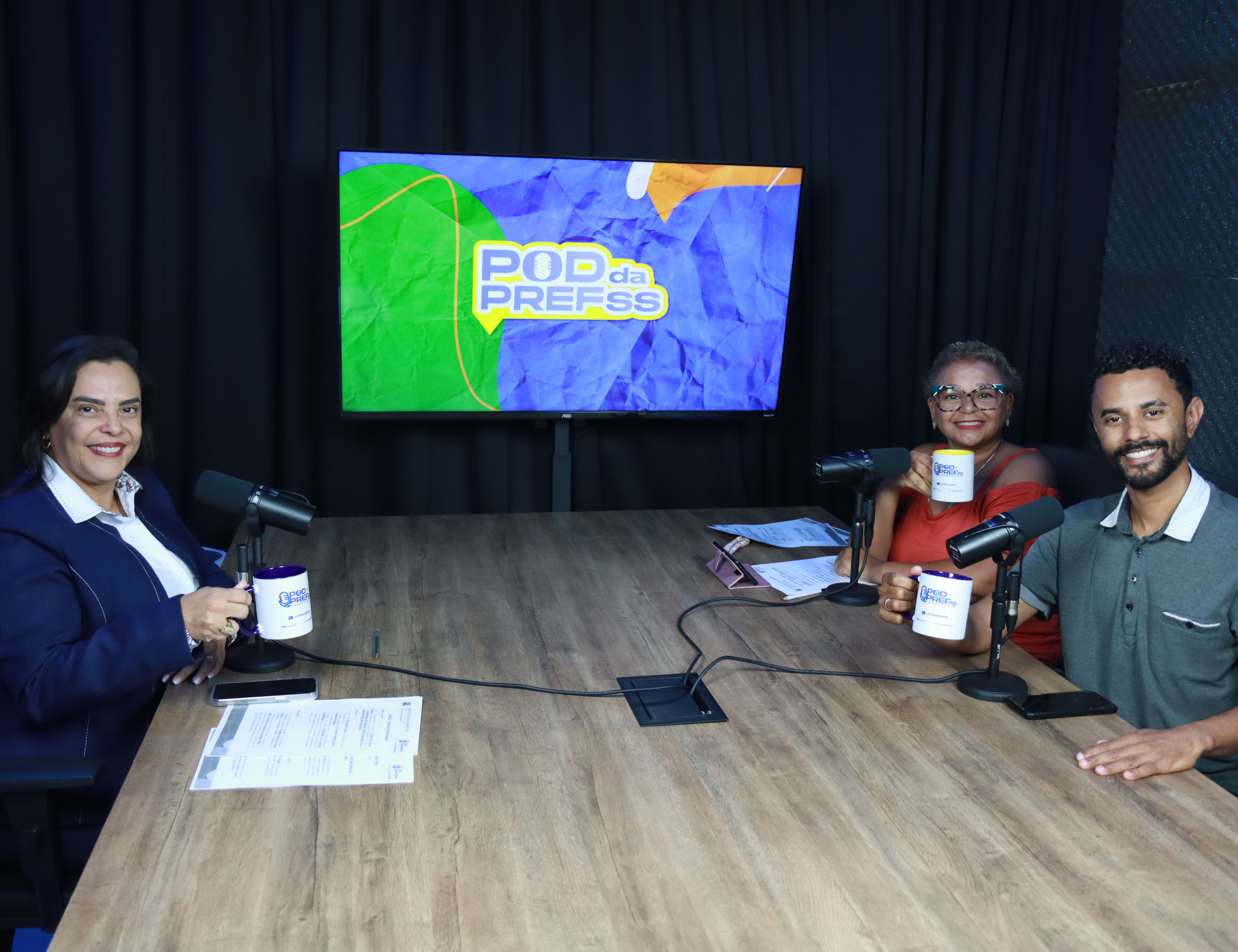 #PraTodosVerem: Imagens mostram a secretária de Educação de São Sebastião, Marta Braz, durante a gravação do episódio do Pod da PrefSS, em um bate-papo descontraído sobre as ações e avanços da rede municipal de ensino. Fim da descrição.