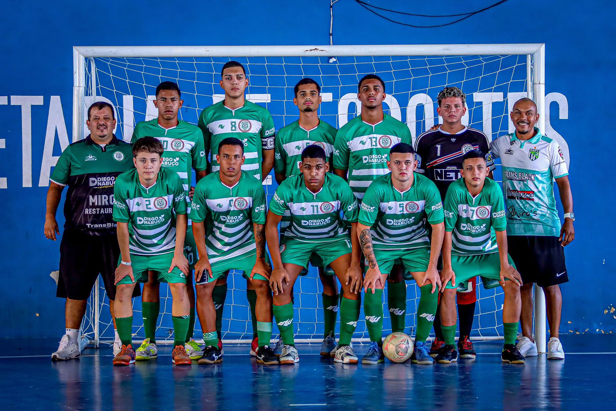 #PraTodosVerem: os semifinalistas da 15ª Copa Sebastianense de Futsal Sub-18 posam para a foto oficial antes das disputas decisivas. Uma das equipes veste uniforme preto com detalhes amarelos, outra utiliza uniforme vermelho, enquanto duas equipes entram em quadra com uniforme verde e branco. Ambas demonstram união e espírito de equipe, representando com garra suas camisas em busca de uma vaga na grande final da competição. Fim da descrição.