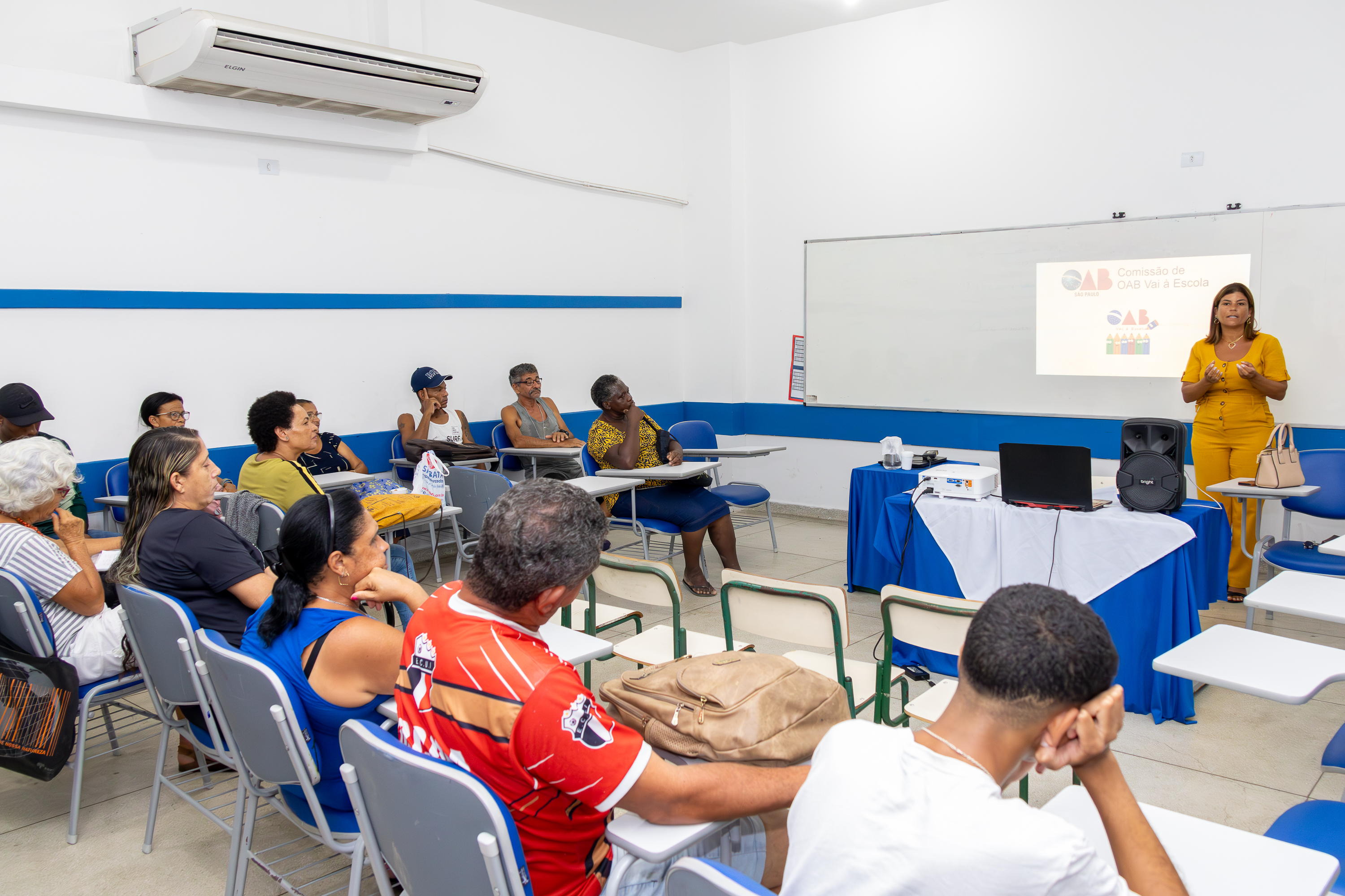#PraTodosVerem: fotos mostram estudantes da EJA durante palestra em sala de aula do OAB vai à Escola. Fim da descrição.