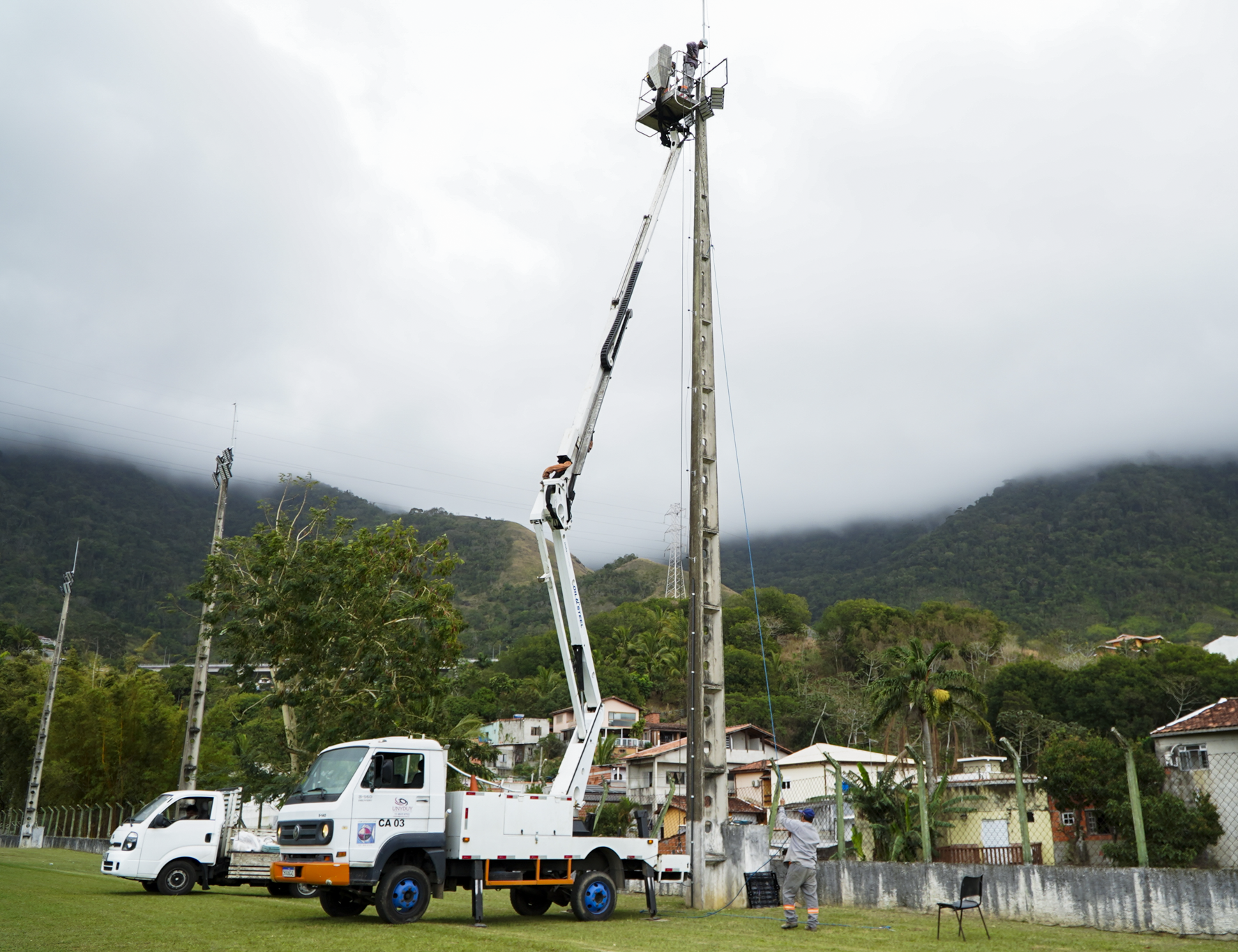 #ParaTodosVerem: Nas imagens, equipes da Prefeitura de São Sebastião realizam serviços de manutenção e troca da iluminação nos campos de futebol. Técnicos utilizam caminhões com cesto aéreo para alcançar os refletores instalados no alto dos postes, garantindo mais segurança e modernidade com a instalação de luminárias de LED. Ao fundo, é possível ver as montanhas, casas e o céu nublado, compondo a paisagem dos bairros onde a ação foi realizada. Fim da descrição.