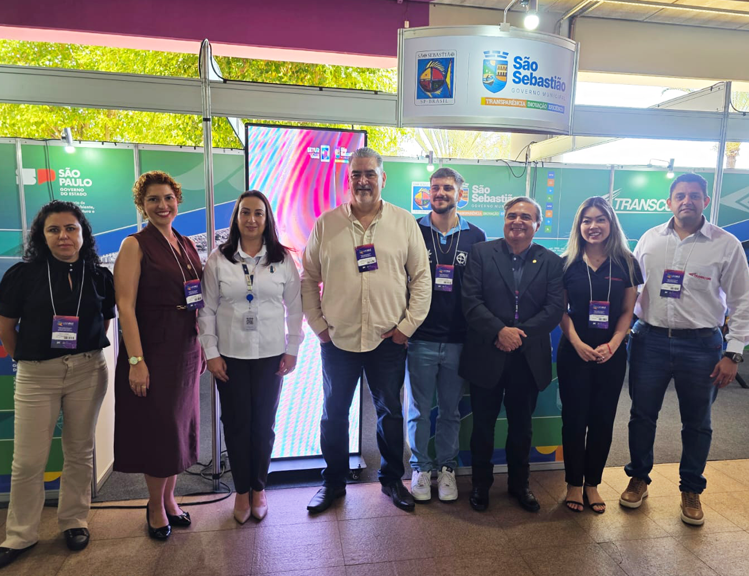#PraTodosVerem: Fotografia colorida de oito pessoas em pé, lado a lado, posando para a câmera em um estande de evento. Ao fundo, há painéis com logomarcas do Governo do Estado de São Paulo, da Prefeitura de São Sebastião e de empresas parceiras. Da esquerda para a direita, aparecem quatro mulheres e quatro homens, todos usando crachás de identificação. O grupo sorri e veste roupas sociais ou casuais sociais, transmitindo formalidade e receptividade. O ambiente é iluminado pela luz natural que entra pelas janelas superiores. Fim da descrição.