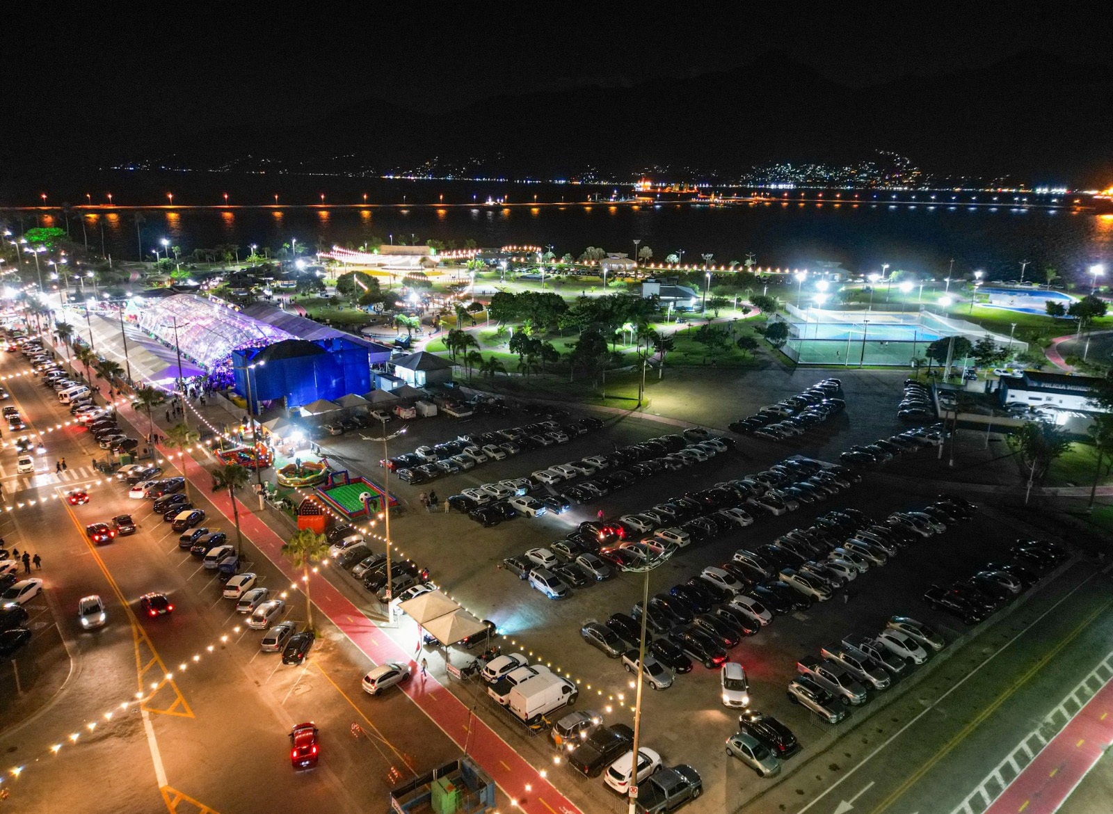 #PraTodosVerem: Imagens aéreas noturnas mostram uma grande área urbana iluminada. Em primeiro plano, há um amplo estacionamento repleto de carros organizados em filas, ladeado por ciclovia e vias bem iluminadas. Ao fundo, observa-se uma estrutura coberta por lona azul e um espaço com arquibancadas repletas de pessoas, com luzes coloridas indicando a realização de um evento festivo. Na segunda imagem, o mesmo local é visto de outro ângulo, revelando o mar refletindo as luzes da cidade ao fundo, além de áreas esportivas iluminadas e ruas com trânsito intenso e decoração luminosa, compondo uma cena vibrante e movimentada. Fim da descrição.
