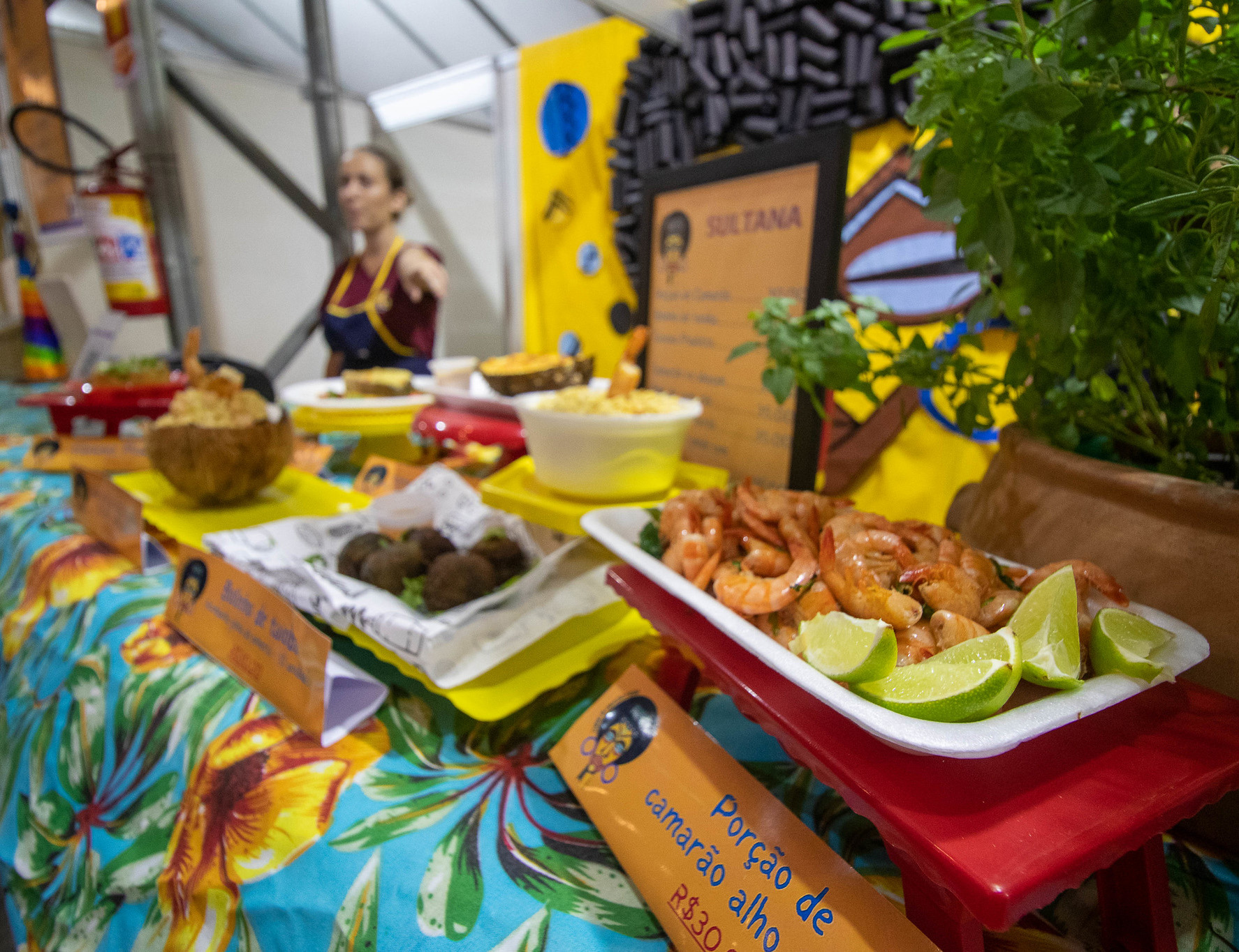 #PraTodosVerem: Na primeira foto, mesas decoradas exibem pratos com camarões e petiscos. Na segunda, acarajés dourados estão dispostos em uma travessa. Na terceira, o público circula e conversa sob uma tenda iluminada com luzes decorativas. Fim da descrição.