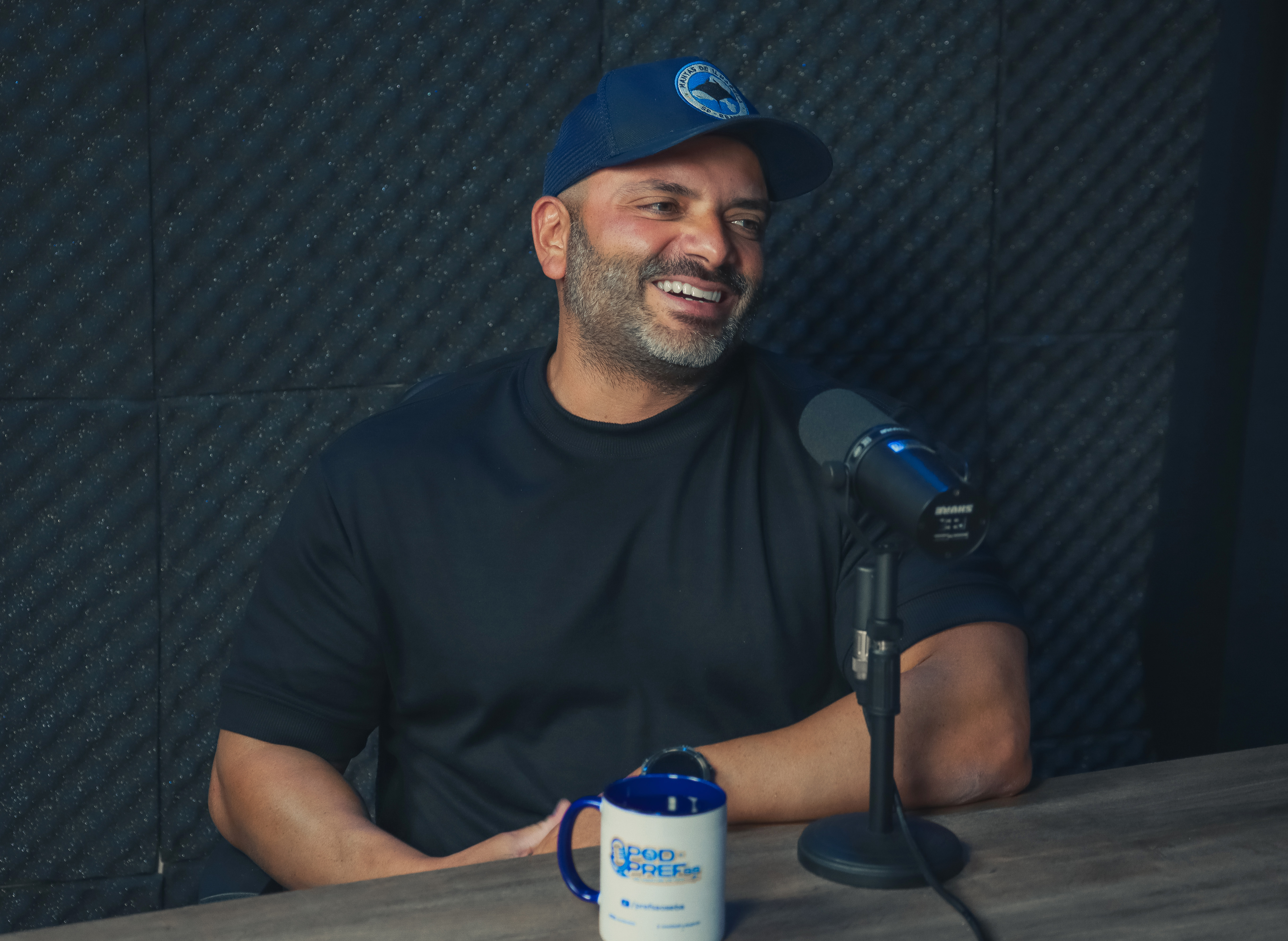 #PraTodosVerem: As imagens registram o clima descontraído da gravação do Pod da Prefs, com os participantes reunidos em estúdio, sorridentes e à vontade durante a conversa. Sentados à mesa, eles compartilham o momento com canecas personalizadas do programa, enquanto o cenário exibe o logotipo no monitor ao fundo. Fim da descrição.