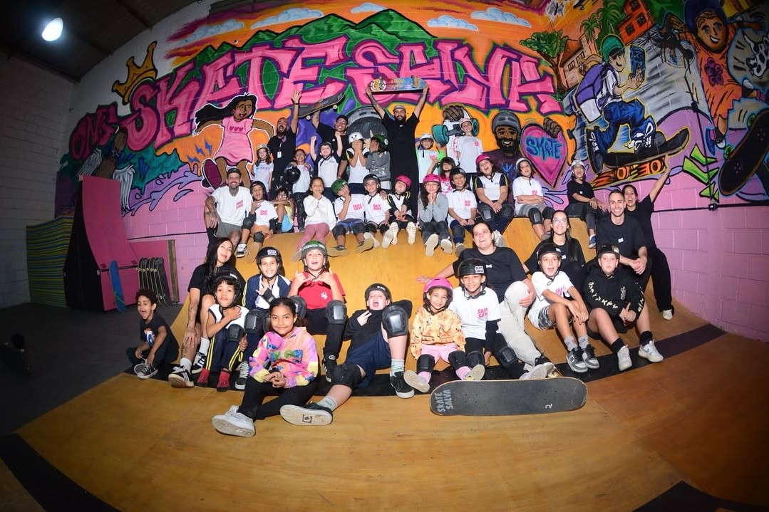 #PraTodosVerem: As fotos capturam cenas na sede da ONG Skate Salva, um skatepark interno caracterizado por murais de grafite extremamente coloridos e rampas de madeira. Outras fotos mostram a interação dos instrutores da ONG, reunidas próxima a uma mini rampa. Fim da descrição.