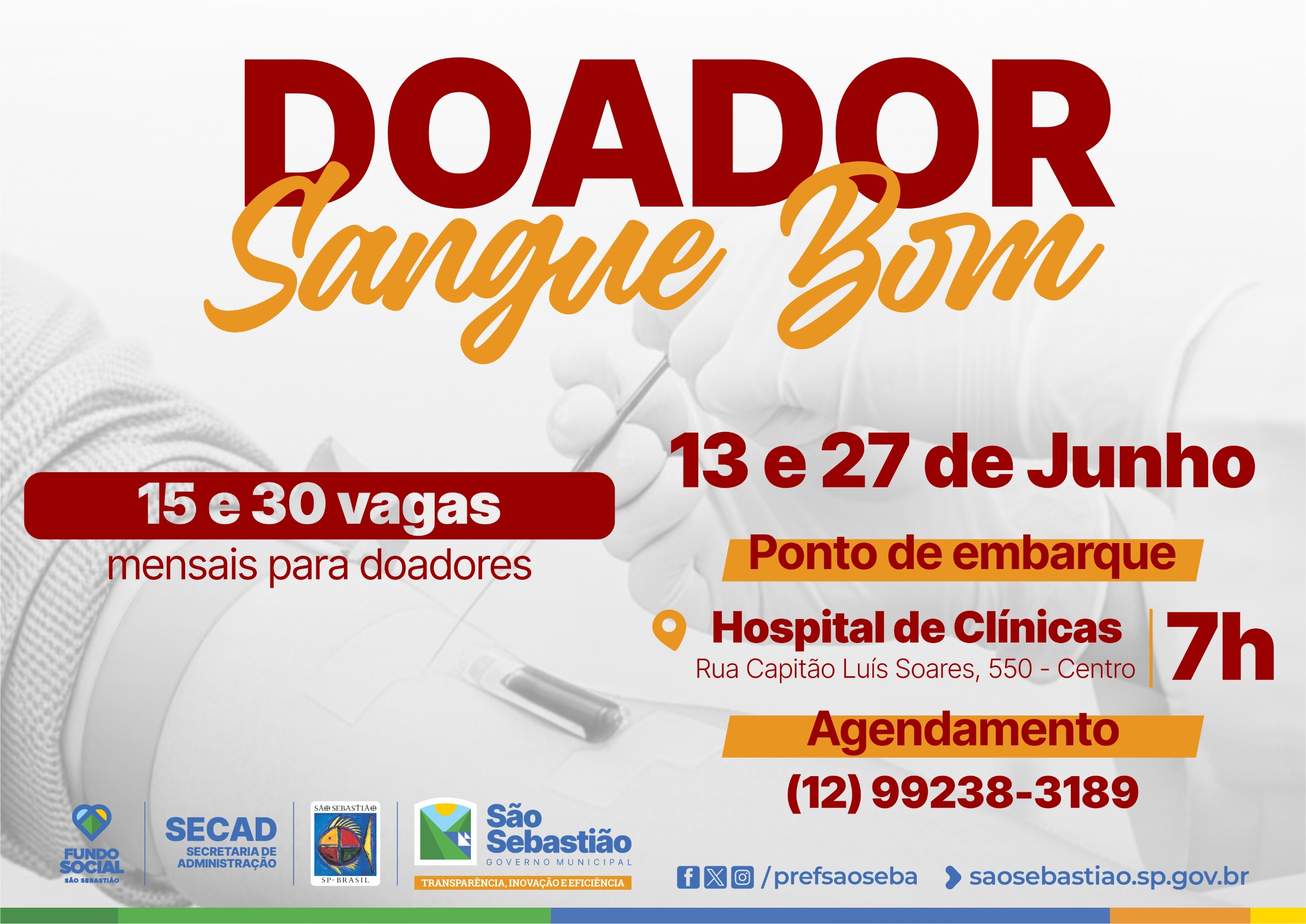 A Prefeitura de São Sebastião, em ação conjunta entre o Fundo Social e a Secretaria de Administração (Secad), e em parceria com o Hospital de Clínicas de São Sebastião, lança a campanha ‘Doador Sangue Bom’, que tem como objetivo incentivar a doação voluntária de sangue pela população em geral e também por parte dos servidores públicos municipais.