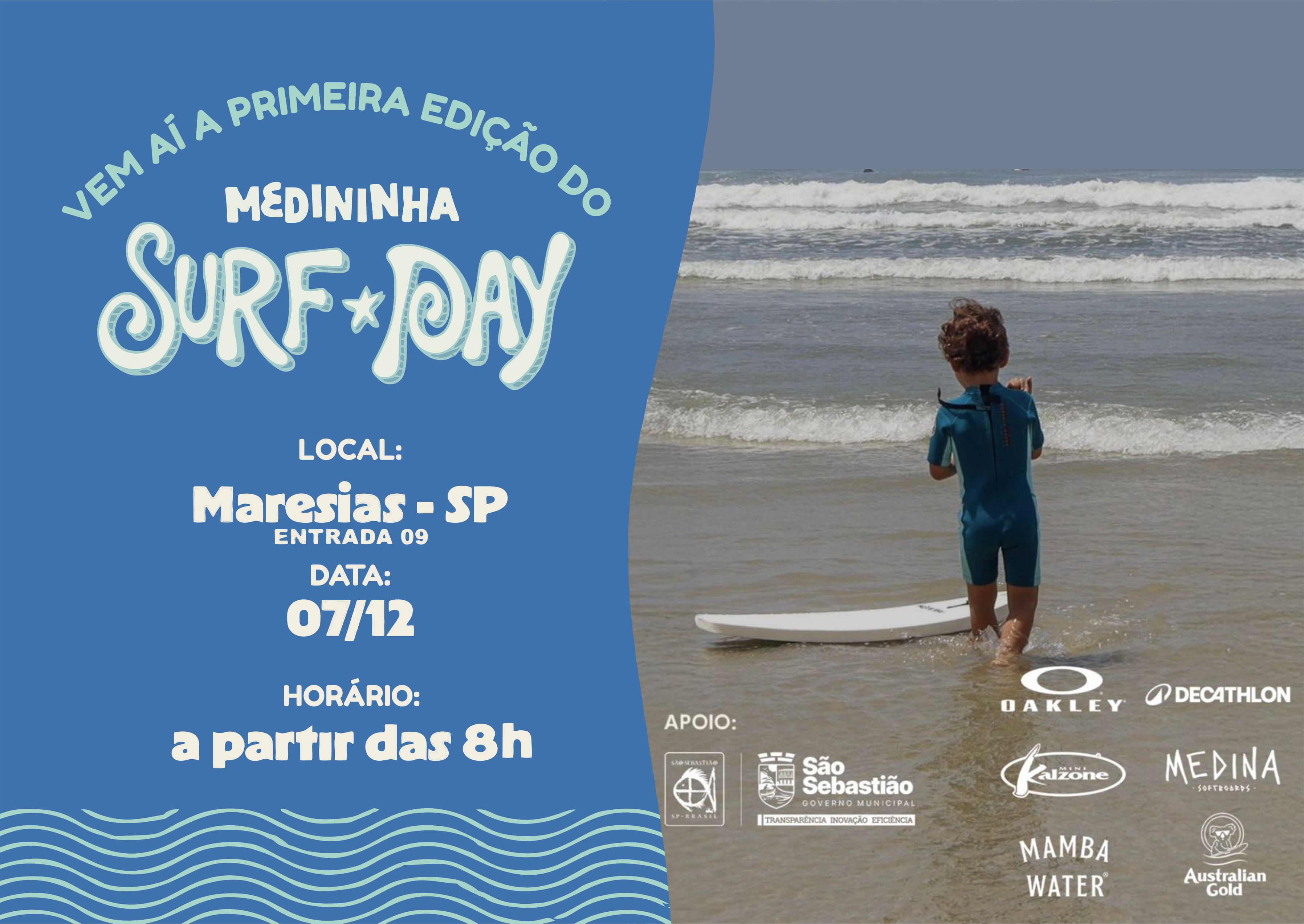 #PraTodosVerem: As imagens mostram a divulgação do evento Medininha Surf Day, que ocorre em Maresias, com um cartaz colorido apresentando o personagem Medininha surfando e destacando data, local e programação, seguido pela aparição do mascote em tamanho real, sorridente e segurando uma prancha ilustrada diante de uma onda cenográfica, transmitindo clima de diversão para o público infantil; por fim, Gabriel Medina posa para foto junto com o público e envolto em uma bandeira do Brasil, celebrando o primeiro título mundial e registrando o momento com alegria. Fim da descrição.