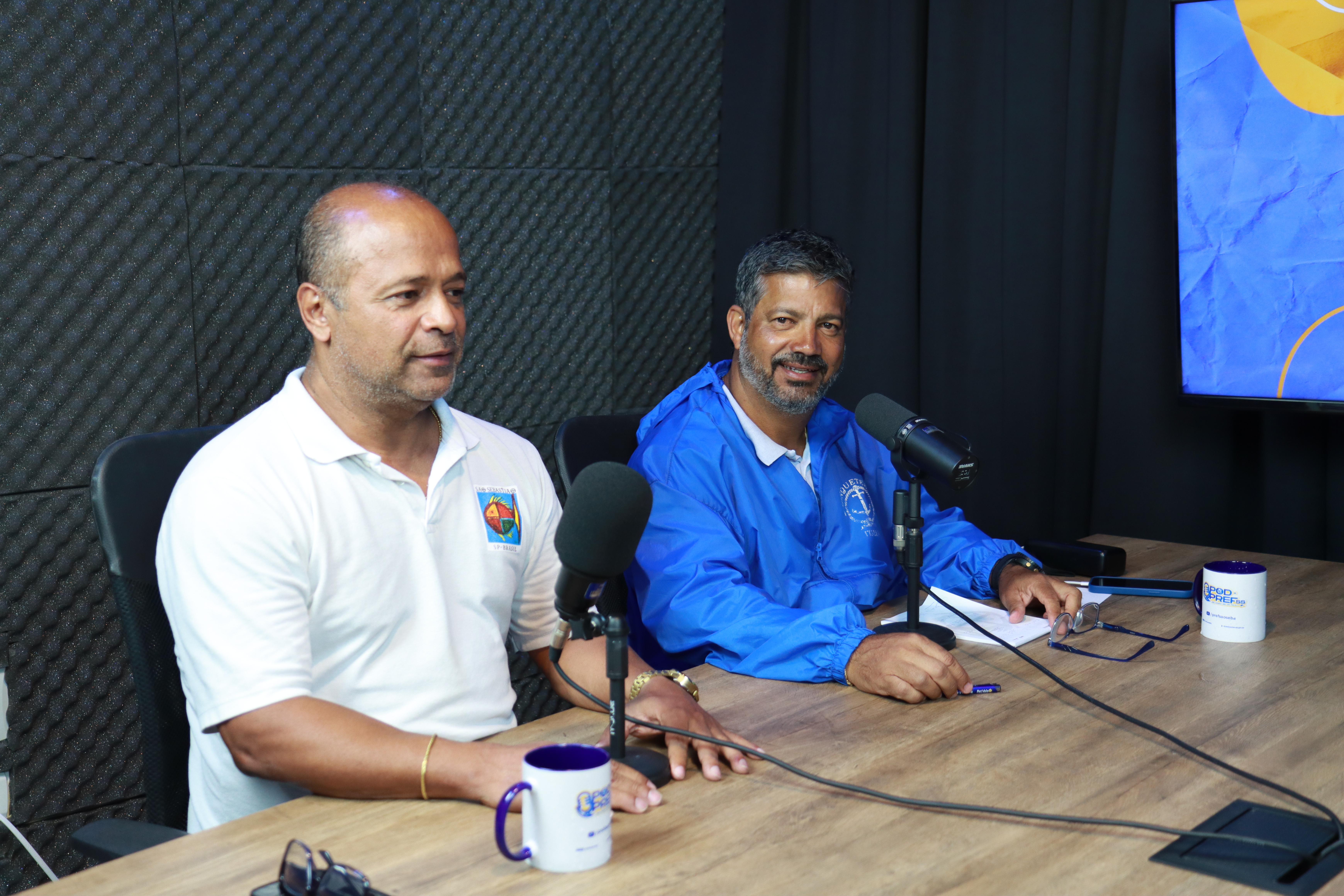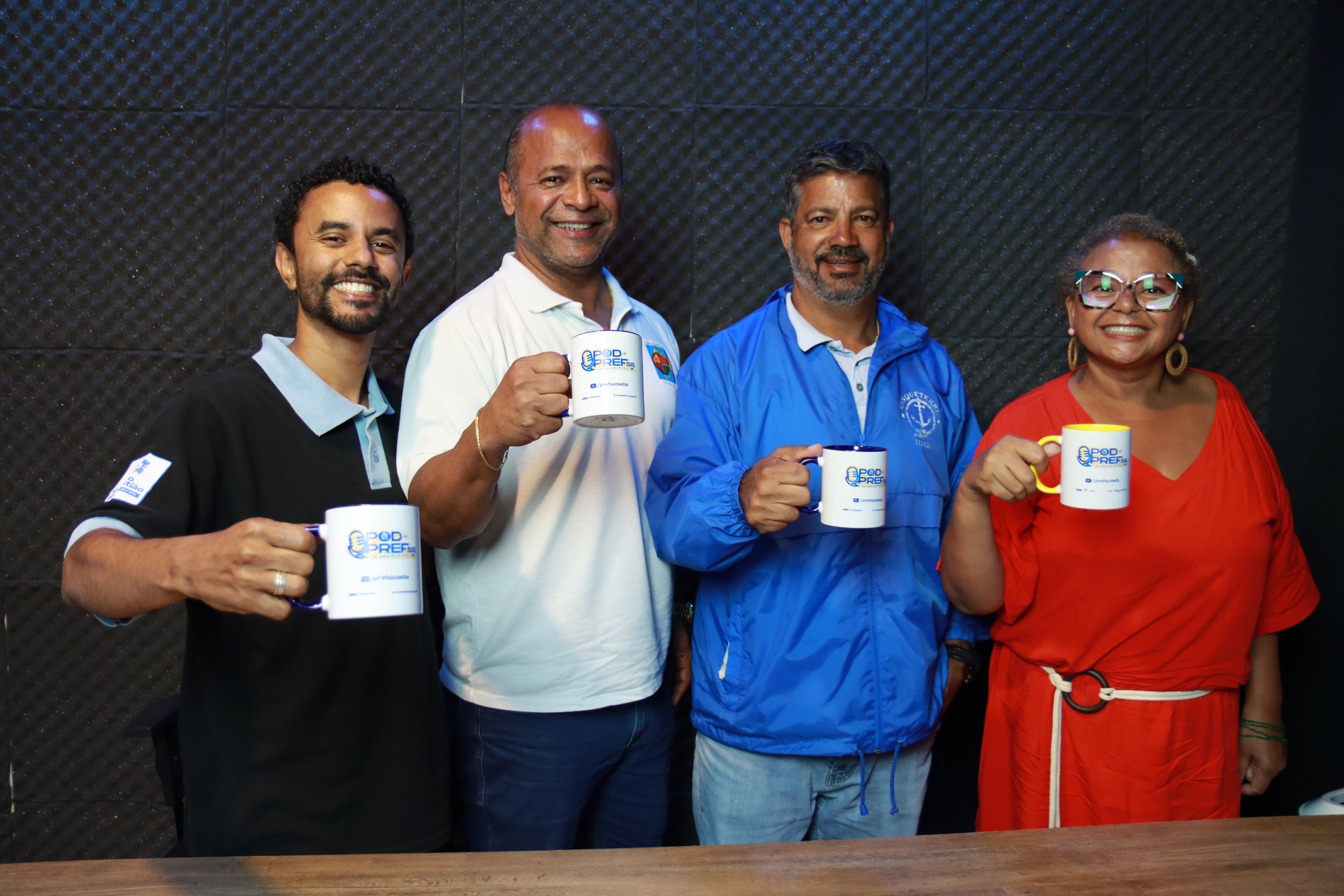 #PraTodosVerem: As imagens registram o clima descontraído da gravação do Pod da Prefs, com os participantes reunidos em estúdio, sorridentes e à vontade durante a conversa. Sentados à mesa, eles compartilham o momento com canecas personalizadas do programa, enquanto o cenário exibe o logotipo no monitor ao fundo. Fim da descrição.