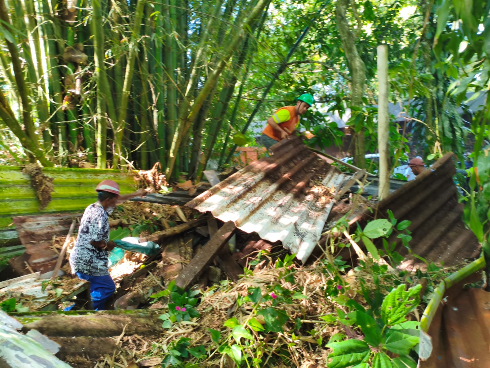 #PraTodosVerem: duas fotos mostram equipes realizando limpeza e retirada de entulho em área de mata. Na primeira imagem, três pessoas, usando equipamentos de proteção como capacetes e luvas, removem telhas de zinco enferrujadas e pedaços de madeira de uma estrutura desmoronada, em meio à vegetação densa com bambus e árvores ao fundo. Na segunda imagem, quatro pessoas estão em frente a uma construção antiga de alvenaria amarela, parcialmente coberta por vegetação. Um dos trabalhadores está na porta, enquanto os outros observam e conversam. Todos usam roupas de trabalho e equipamentos de segurança. O ambiente é cercado por plantas e árvores nativas. Fim da descrição.