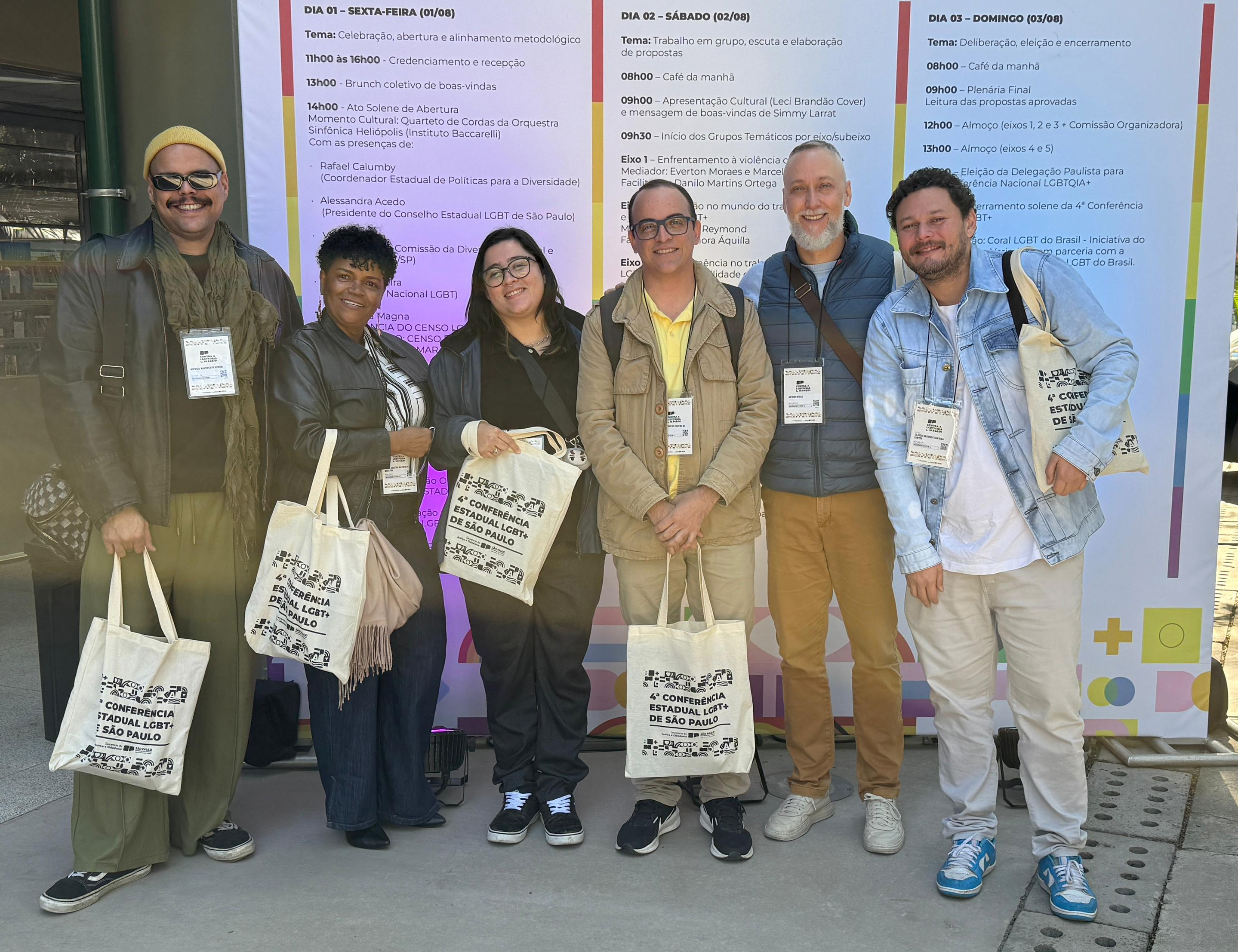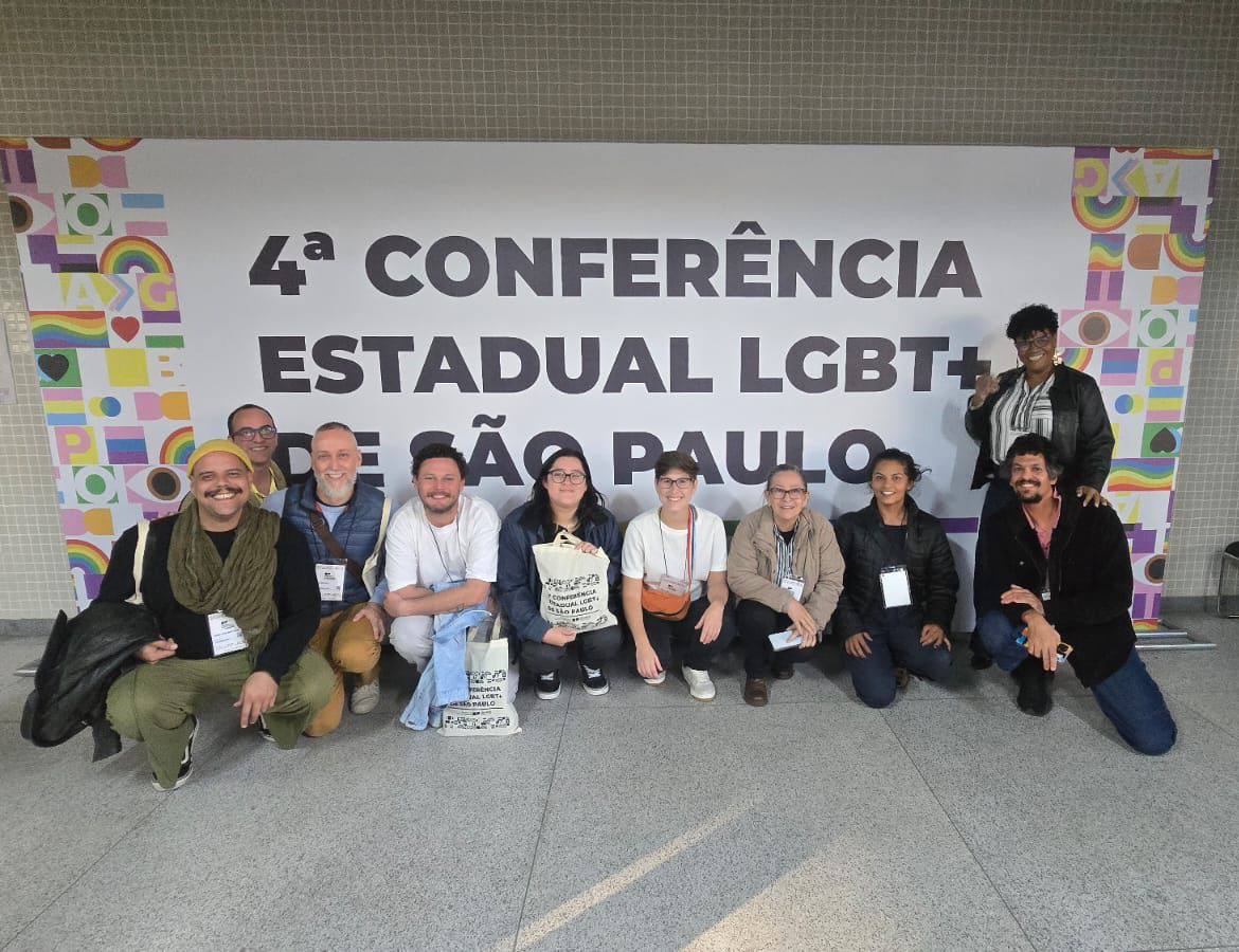 #PraTodosVerem: um grupo de pessoas posa sorridente em frente a um painel escrito "4ª Conferência Estadual LGBT+ de São Paulo". Todos estão agachados ou em pé, lado a lado. O painel tem cores e símbolos representando a diversidade. Fim da descrição.