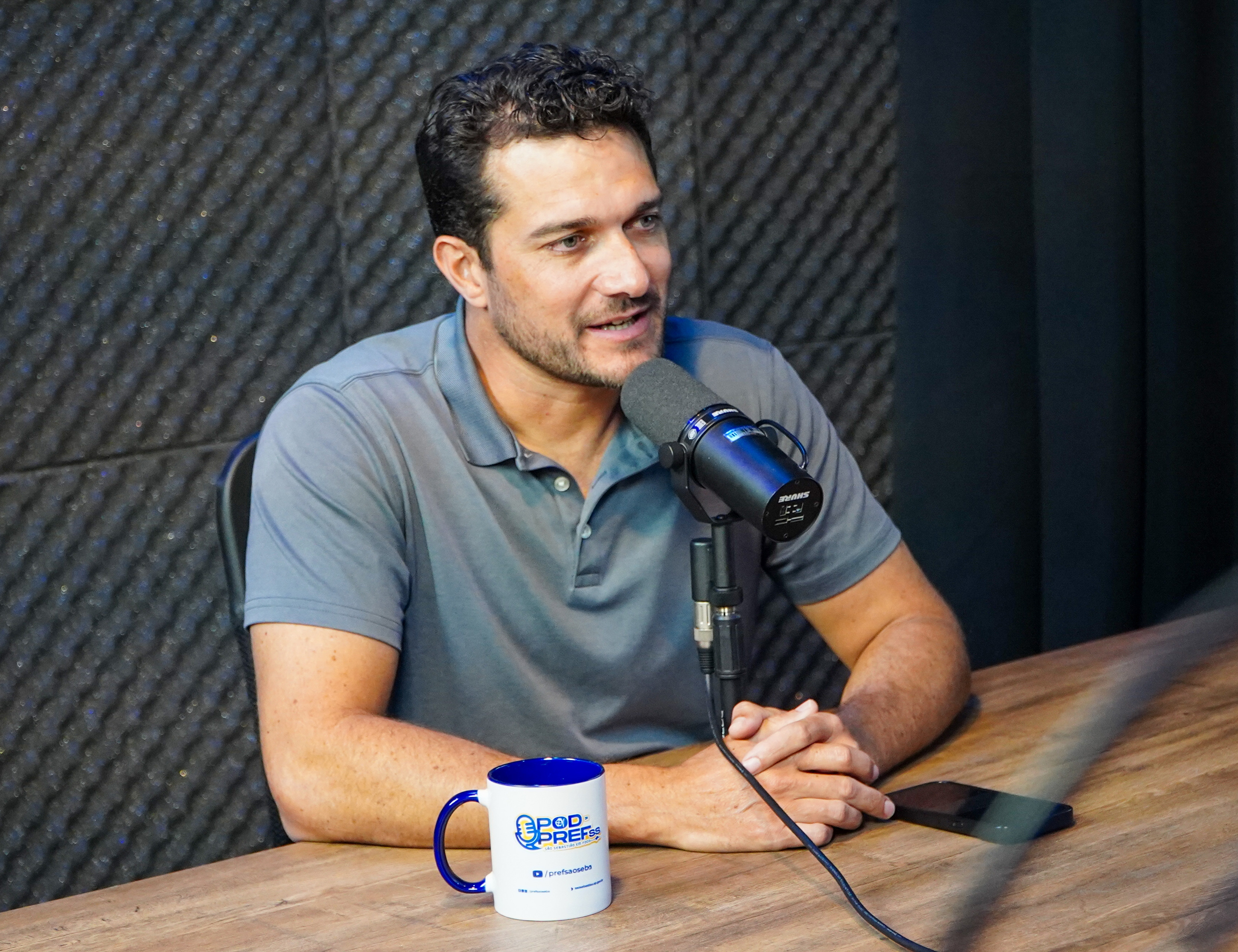 #PratodosVerem: durante a gravação do Pod da PrefSS, o secretário de Esportes de São Sebastião, Ubiratan Mourão, participa de uma conversa descontraída com o apresentador Rafael César. Sentados frente a frente em uma mesa de madeira, os dois estão posicionados diante de microfones profissionais, com canecas personalizadas do podcast e o logo do programa exibido em uma tela ao fundo. Fim da descrição.