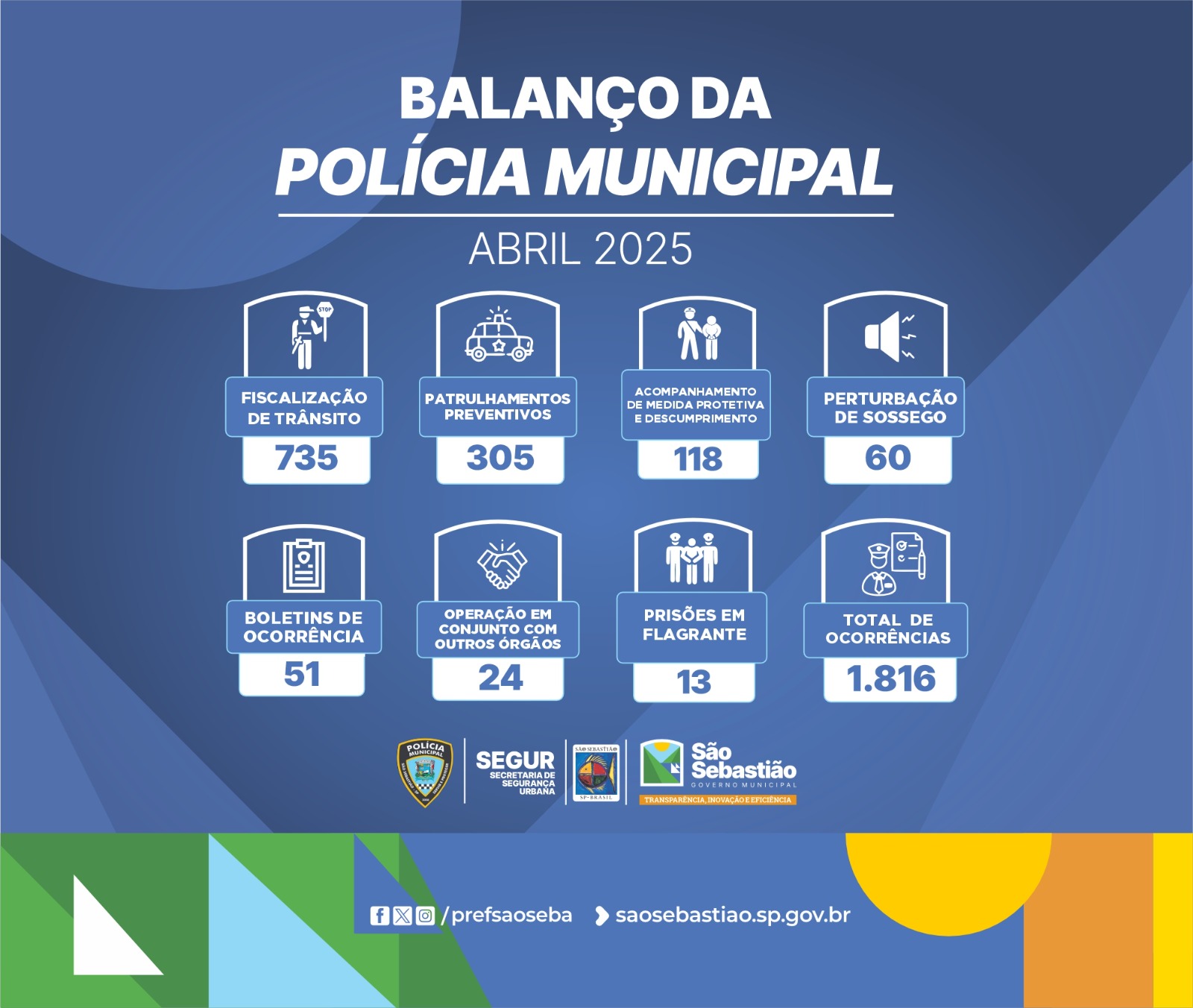 Balanço divulgado pela Polícia Municipal de São Sebastião aponta um crescimento em torno 9,3% nos atendimentos no mês de abril quando comparado com março. Foram 1.816 registros contra 1.662 em março.