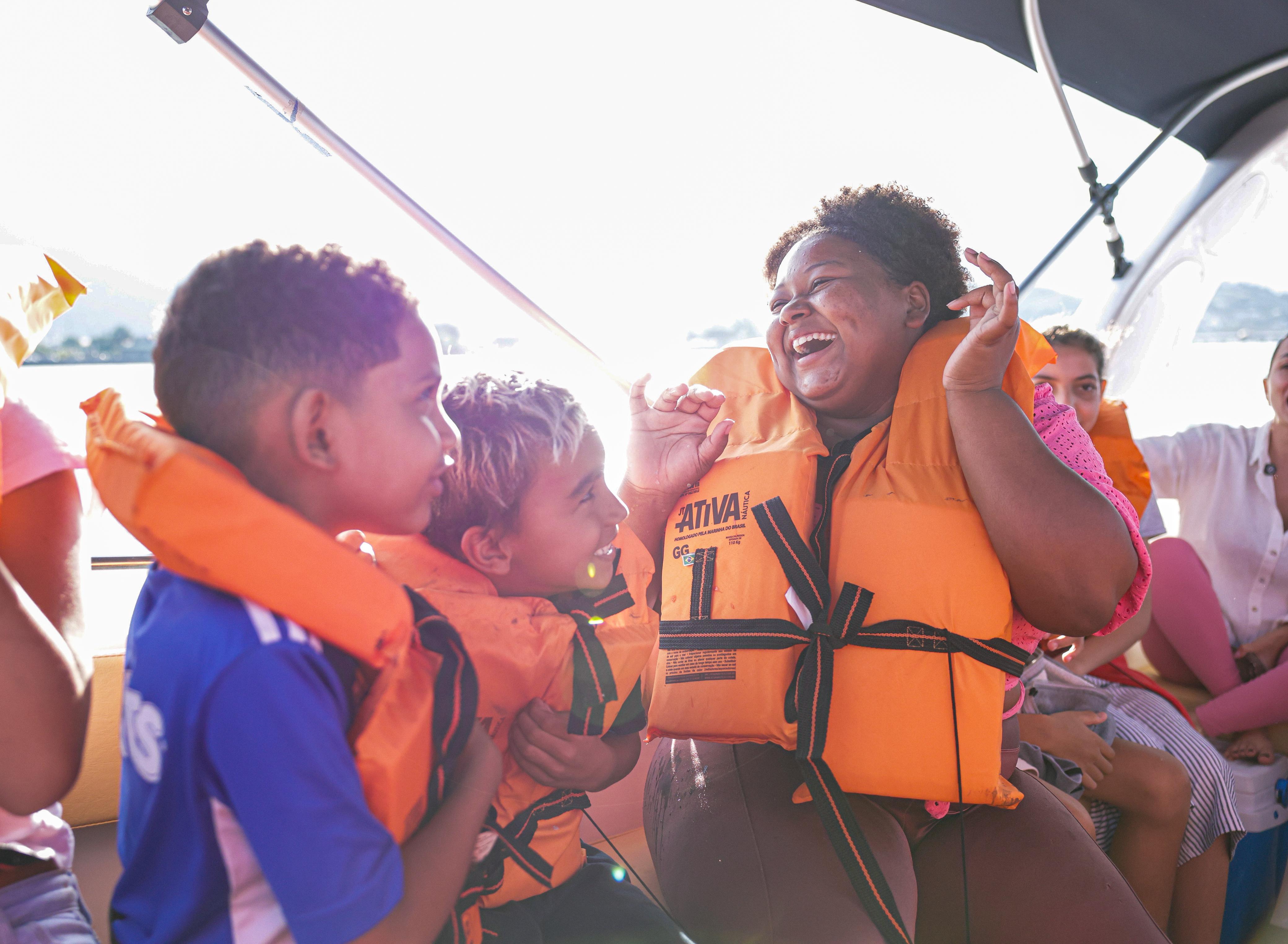 #PraTodosVerem: Sequência de quatro imagens que retratam momentos especiais de uma atividade de avistamento de baleias com crianças. Na primeira imagem, um grupo de aproximadamente 25 pessoas, entre crianças e adultos, posa sorridente para a foto em um gramado à beira-mar. Ao fundo, o mar, coqueiros e montanhas compõem a paisagem ao entardecer. As crianças demonstram alegria, algumas enroladas em toalhas, enquanto os adultos acompanham com carinho. Na segunda imagem, dentro de uma embarcação, duas crianças e uma jovem interagem com entusiasmo, todos usando coletes salva-vidas laranja. A jovem sorri amplamente, transmitindo um momento de leveza e conexão durante o passeio. Na terceira imagem, no meio do mar azul, a nadadeira de uma baleia jubarte surge fora d’água, com gotas escorrendo. Ao fundo, vegetação densa e montanhosa emoldura a cena, registrando um momento mágico de contato com a natureza.Na quarta imagem, dois meninos estão sentados lado a lado no barco, com coletes salva-vidas, observando a paisagem ao redor. Ao fundo, o mar calmo e montanhas completam o cenário de contemplação. As imagens capturam o encantamento, a descoberta e a alegria de uma vivência transformadora promovida às crianças em contato com o mar e a vida marinha. Fim da descrição.