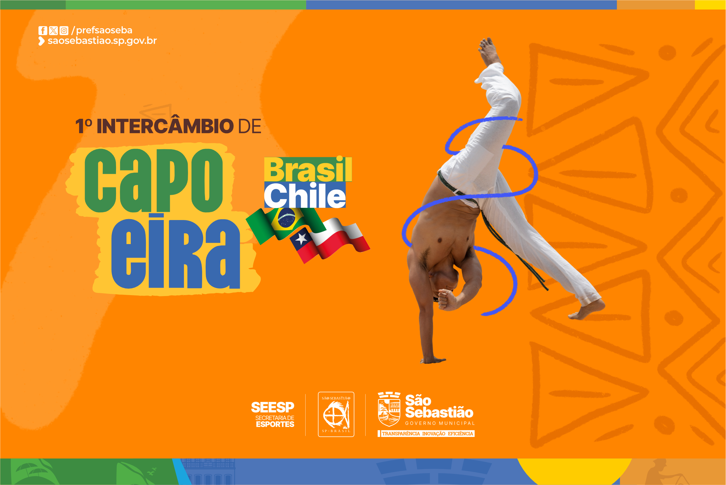 #PraTodosVerem: nas imagens, Mestre Kalunga aparece sorridente, tocando berimbau com entusiasmo durante atividade cultural; em outra, ele segura o instrumento com concentração, vestindo camiseta do Centro Cultural Capoedendê. Em seguida, está ao lado de dois colegas capoeiristas, todos com camisetas azuis do grupo Capoeira de Meu Deus, demonstrando união e companheirismo. Por fim, um card colorido anuncia o “1º Intercâmbio de Capoeira Brasil e Chile”, com elementos visuais vibrantes, bandeiras dos dois países e um capoeirista executando um movimento de ponta-cabeça, promovendo o evento multicultural em São Sebastião. Fim da descrição.