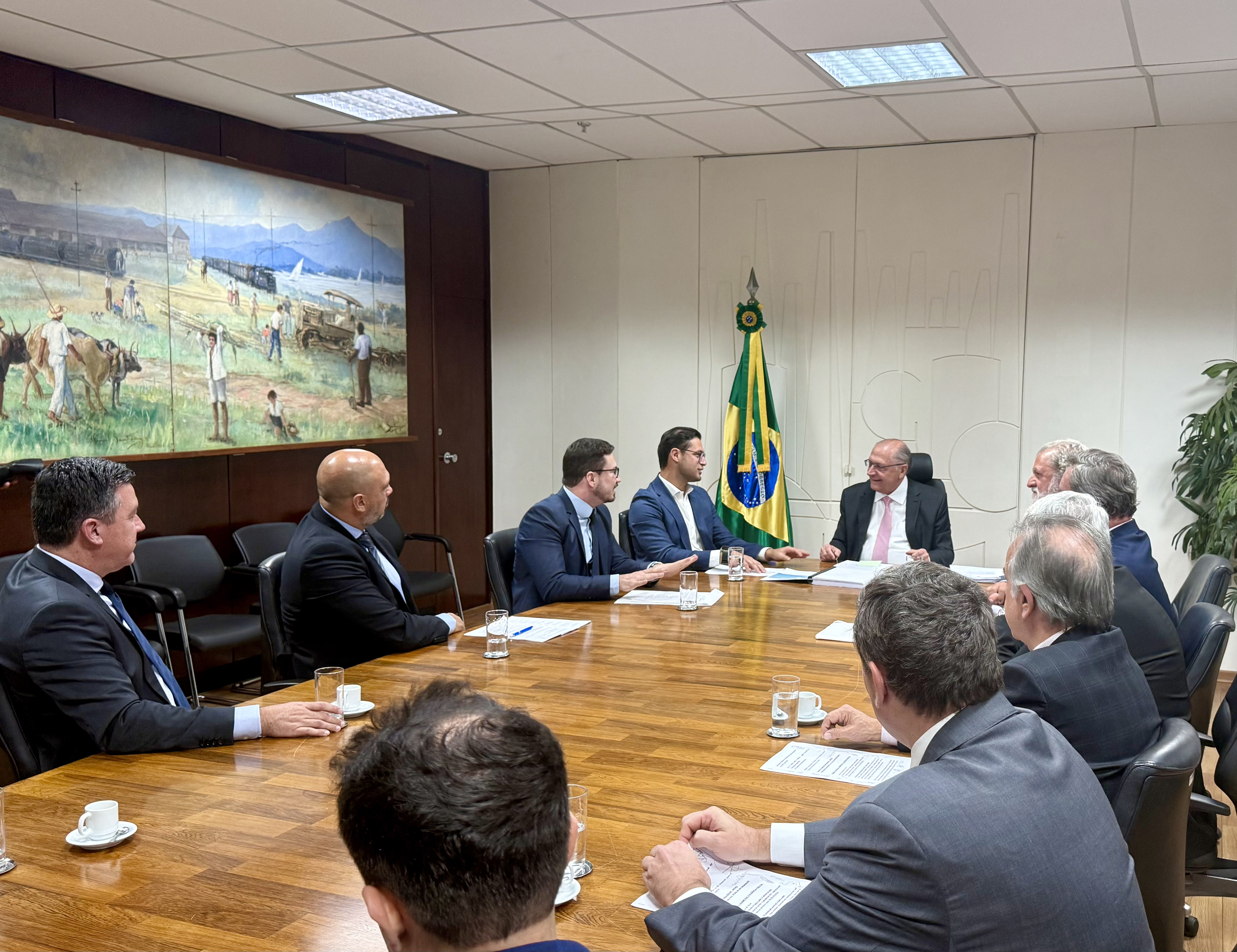 #PraTodosVerem: Em uma sala de reuniões oficial, com bandeira do Brasil ao fundo, o prefeito Reinaldinho Moreira aparece em encontro com o vice-presidente da República, Geraldo Alckmin. Na primeira imagem, os dois estão sentados frente a frente à mesa, em diálogo. Depois, ambos sorriem, acompanhados por outros homens de terno, durante a reunião. Sobre a mesa, há copos de água, papéis, cadernos e uma pasta com documentos. Ao fundo, um quadro retrata uma cena rural. Fim da descrição