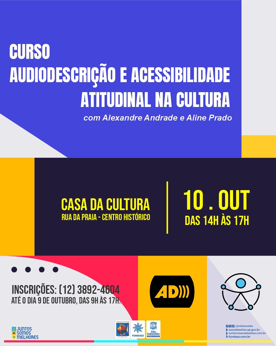 A Prefeitura de São Sebastião, por meio da Fundação Educacional e Cultural ‘Deodato Sant’Anna’ (Fundass), oferecerá, gratuitamente, no dia 10 de outubro, o curso ‘Audiodescrição e Acessibilidade Atitudinal na Cultura’, ministrado pelos profissionais Alexandre Andrade e Aline Prado.