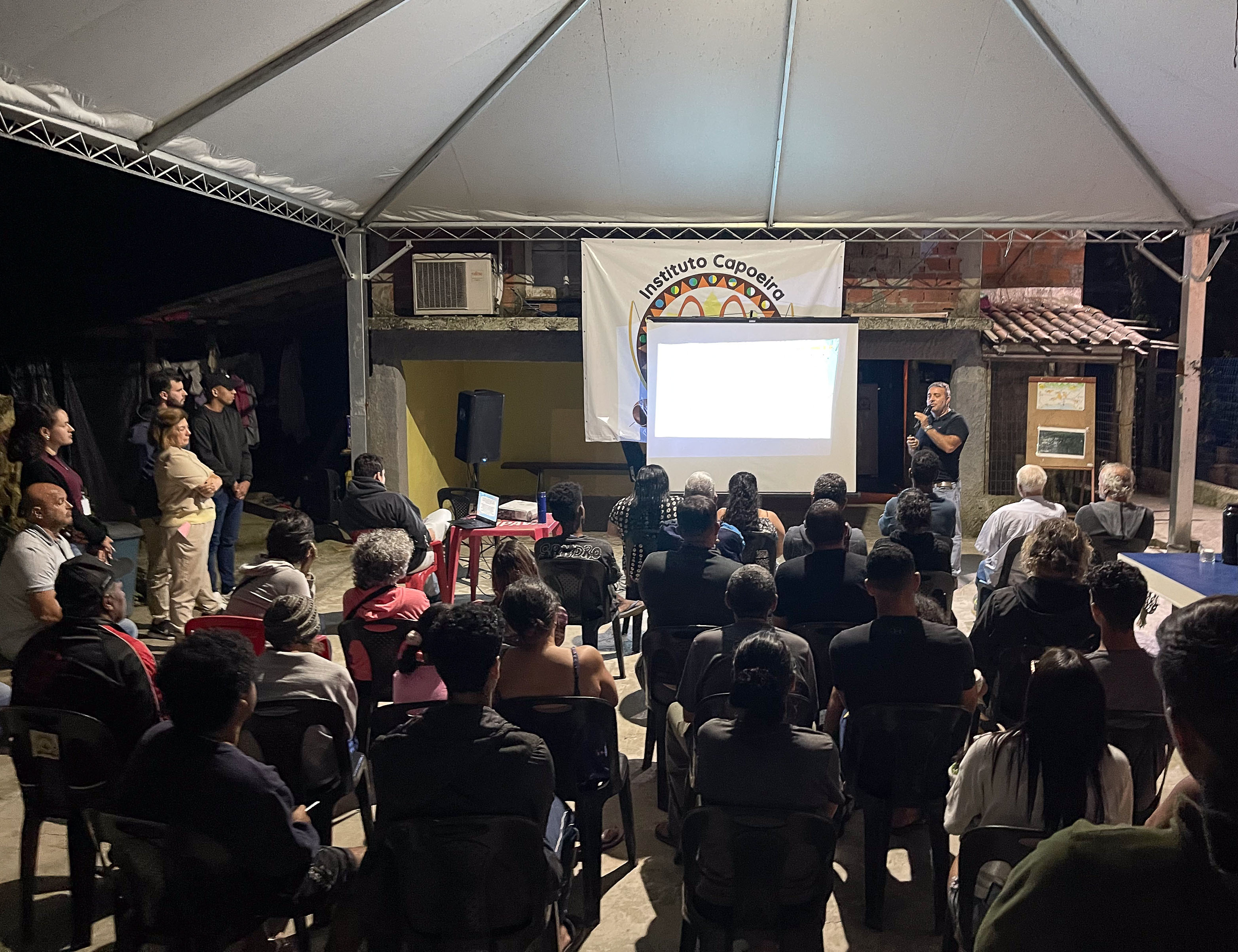 #PraTodosVerem: As imagens mostram momentos de uma reunião comunitária sobre regularização fundiária. Na primeira foto, um grupo de pessoas está sentado sob uma tenda assistindo a uma apresentação projetada em uma tela branca; à frente, um homem fala ao microfone. No fundo, há um banner do Instituto Capoeira pendurado na parede. A segunda imagem mostra um homem assinando uma lista de presença sobre uma prancheta, enquanto uma mulher de camisa branca e crachá observa; eles estão em um ambiente interno com iluminação amarelada e parede escura. Fim da descrição.
